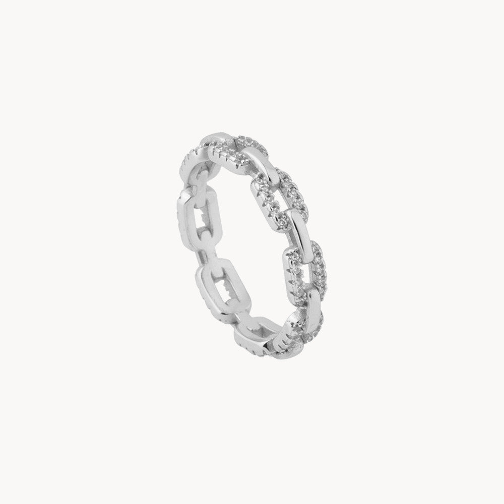 Joseph CZ es un anillo de inspiración vintage con un diseño clásico en forma de cadena con circonitas blancas sobre los eslabones.