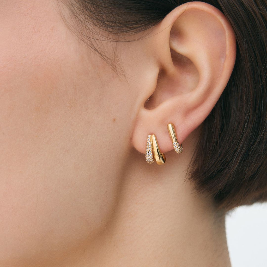 En forma de dos gotas una lisa y otra con circonitas pavé para aportar brillo a tu rostro .