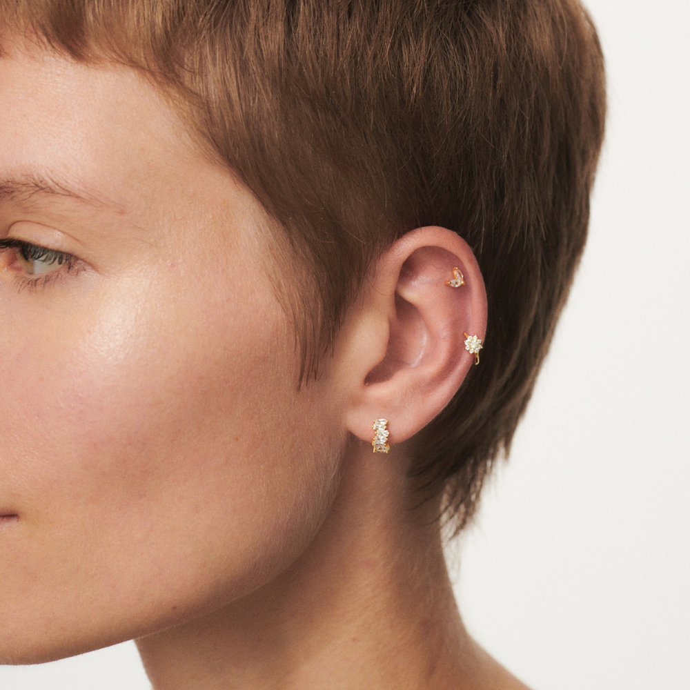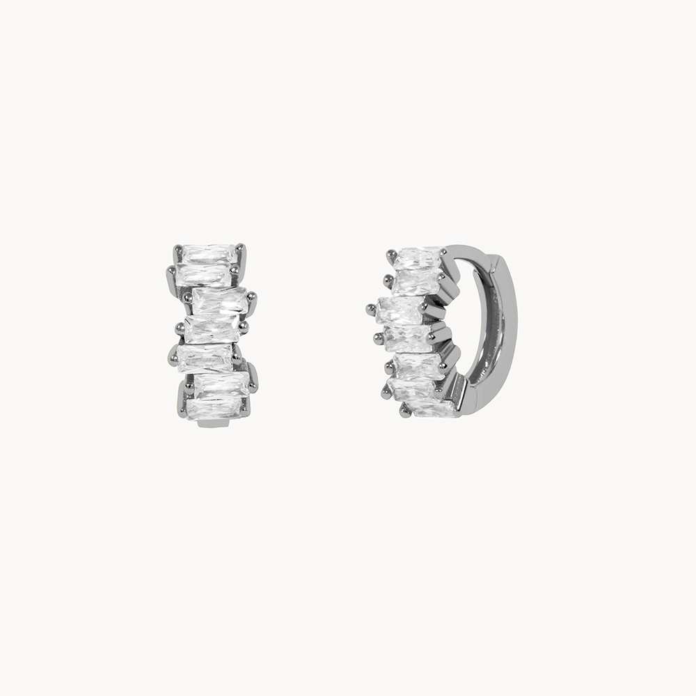 Lissie son unos pendientes de aro con circonita blancas rectangulares tipo baguette dispuestos de forma irregular que le dan ese toque de gracias y desenfado ideales para llevar en tu día a día.