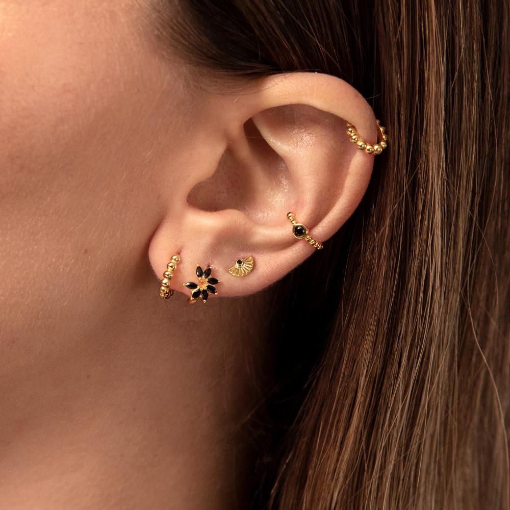 Song son unos pendientes de aro con una flor abierta con circonitas. Es el pendiente perfecto para llevar tanto como accesorio principal como en el segundo agujero.