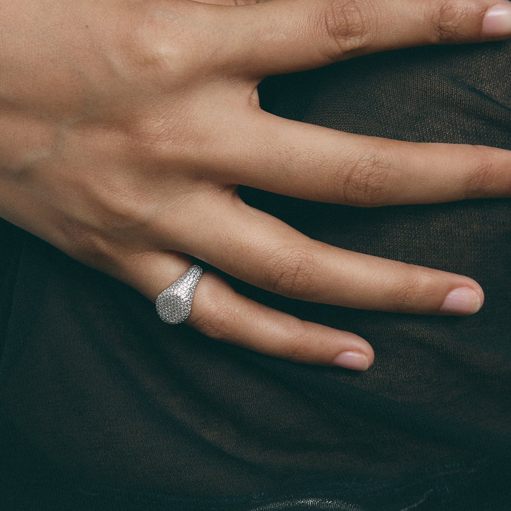 El Boreal Signet, con su superficie de circonitas blancas, refleja la energía interior con un brillo sereno y constante.
