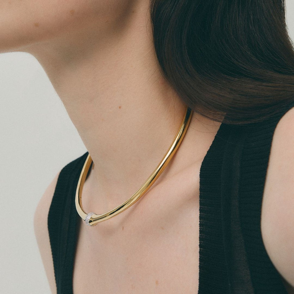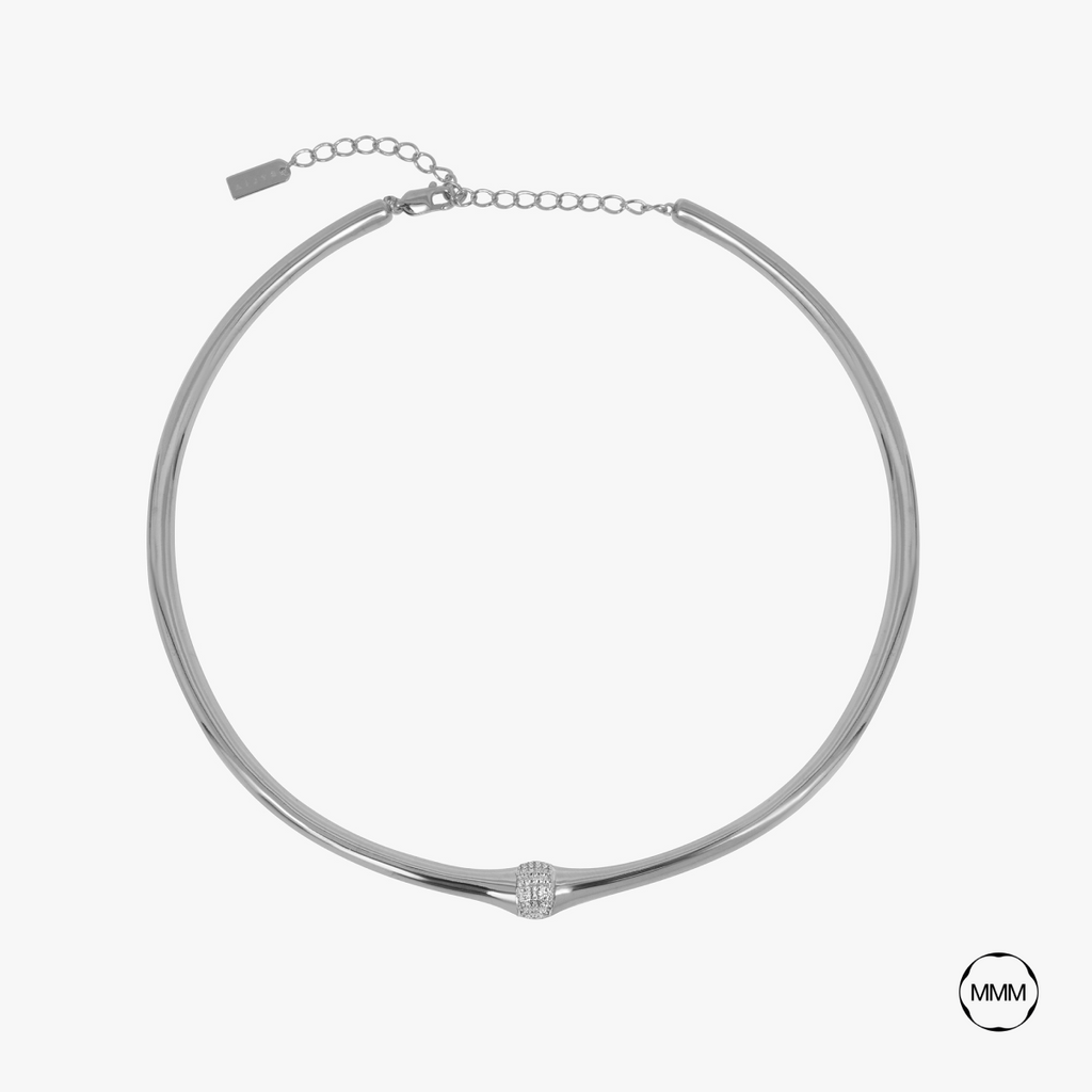 Nova es un choker rígido y macizo con circonitas cuidadosamente engarzadas en su parte frontal con un leve volumen a modo de bola que capta perfectamente la luz de una manera delicada y sofisticada.