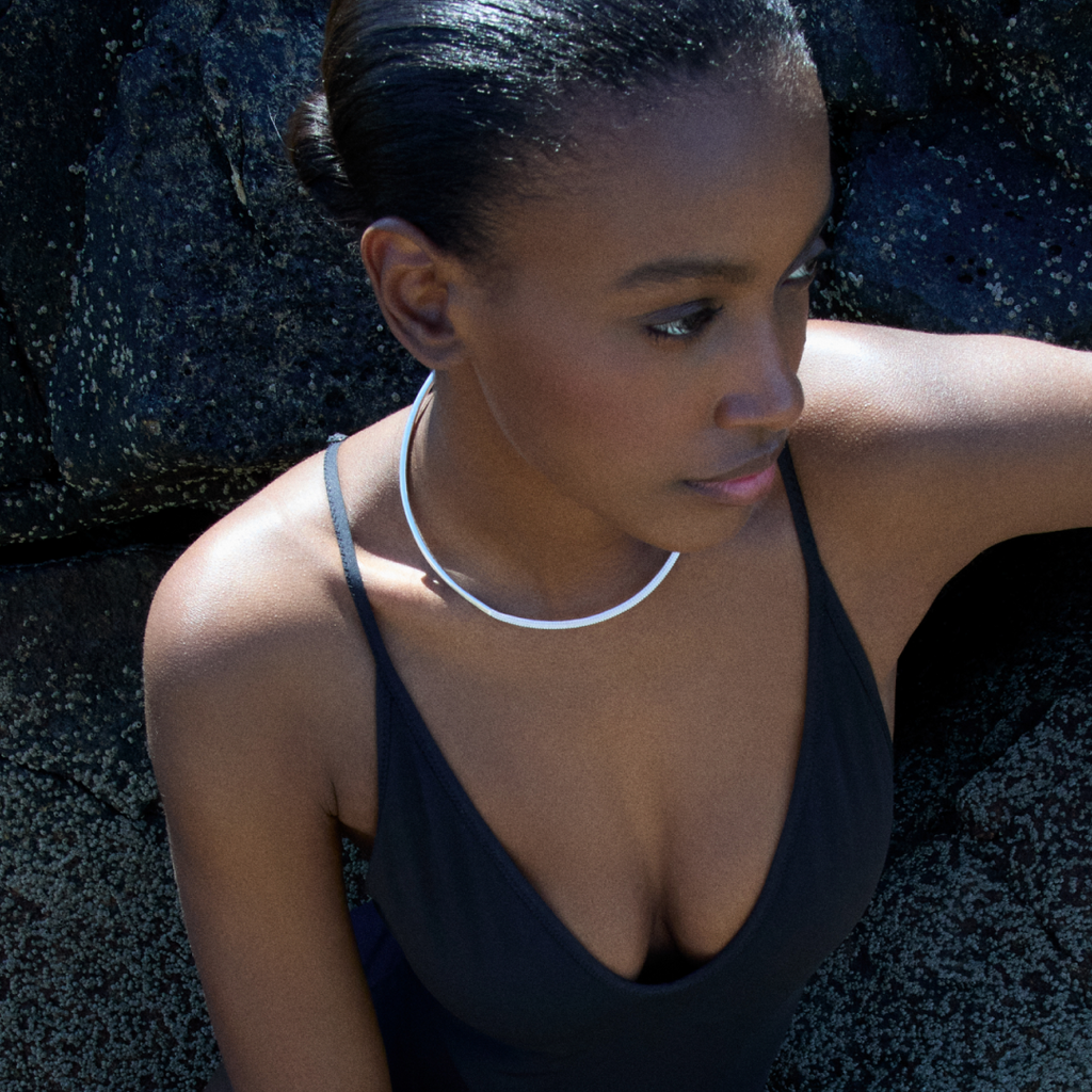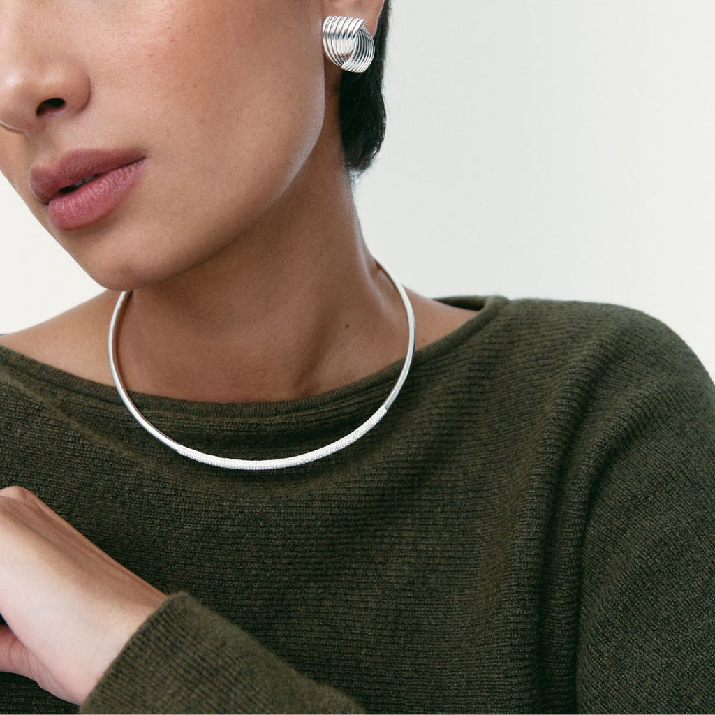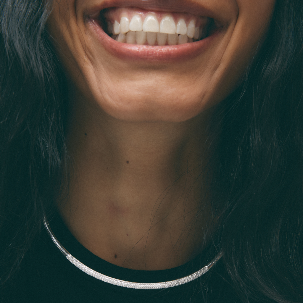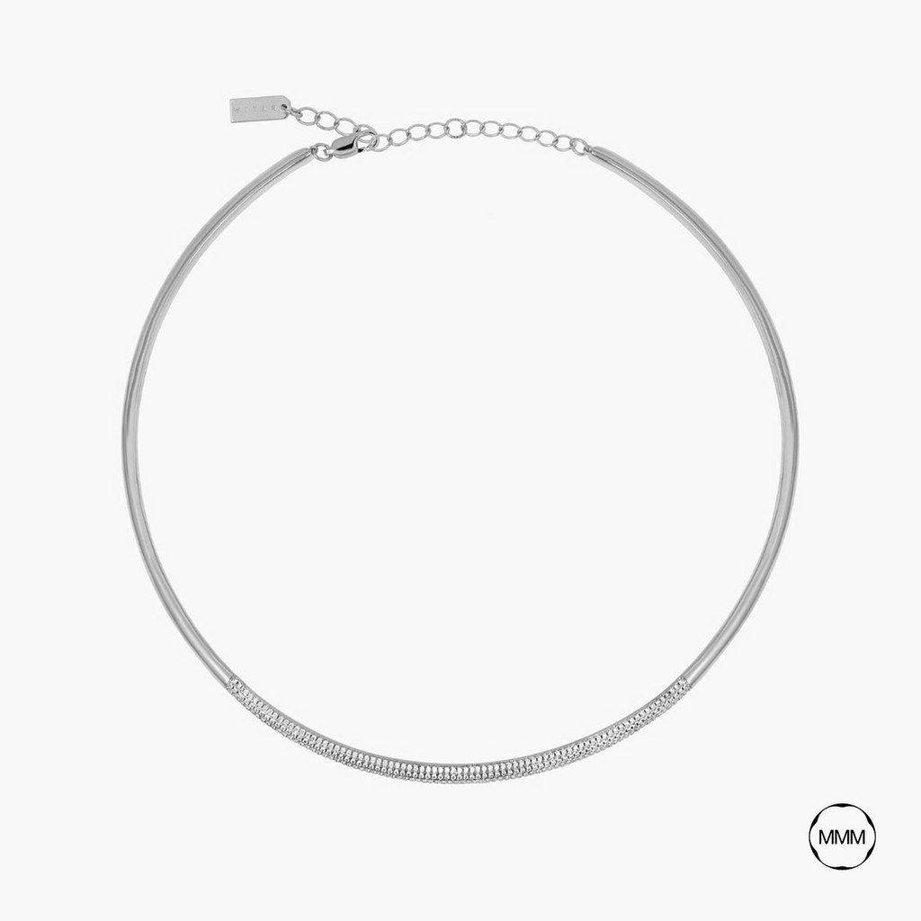 Celestia es un choker rígido con circonitas cuidadosamente engarzadas en todo su frente, captando perfectamente la luz de una manera delicada y sofisticada.