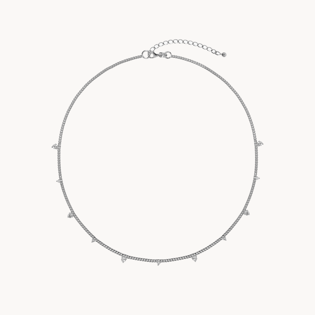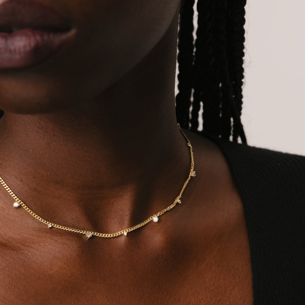 Elke es collar con una cadena barbada con circonitas blancas cúbicas, alternando unas más grandes con otras circonitas más pequeñas.
