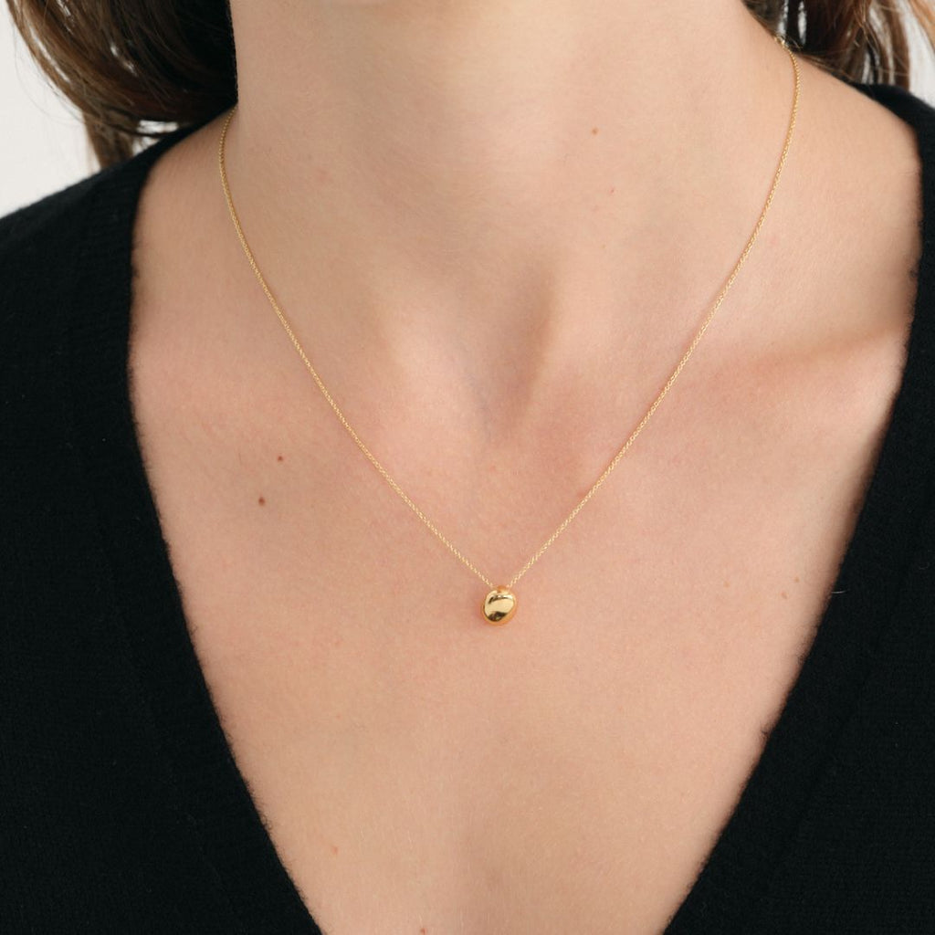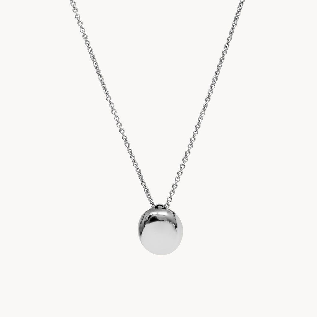 Halo tiene un charm de forma orgánica, asimétrica y pulida en brillante. La superficie del charm refleja la luz de manera suave y sutil, destacando su diseño liso.
