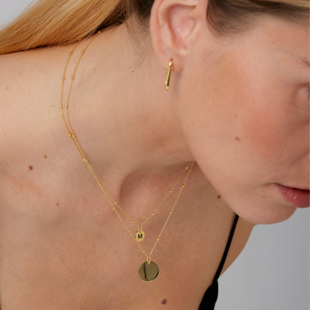 Medal Sundae es un collar de plata 925 bañado en oro de 18 kt con una cadena de bolitas y un charm de placa redonda.