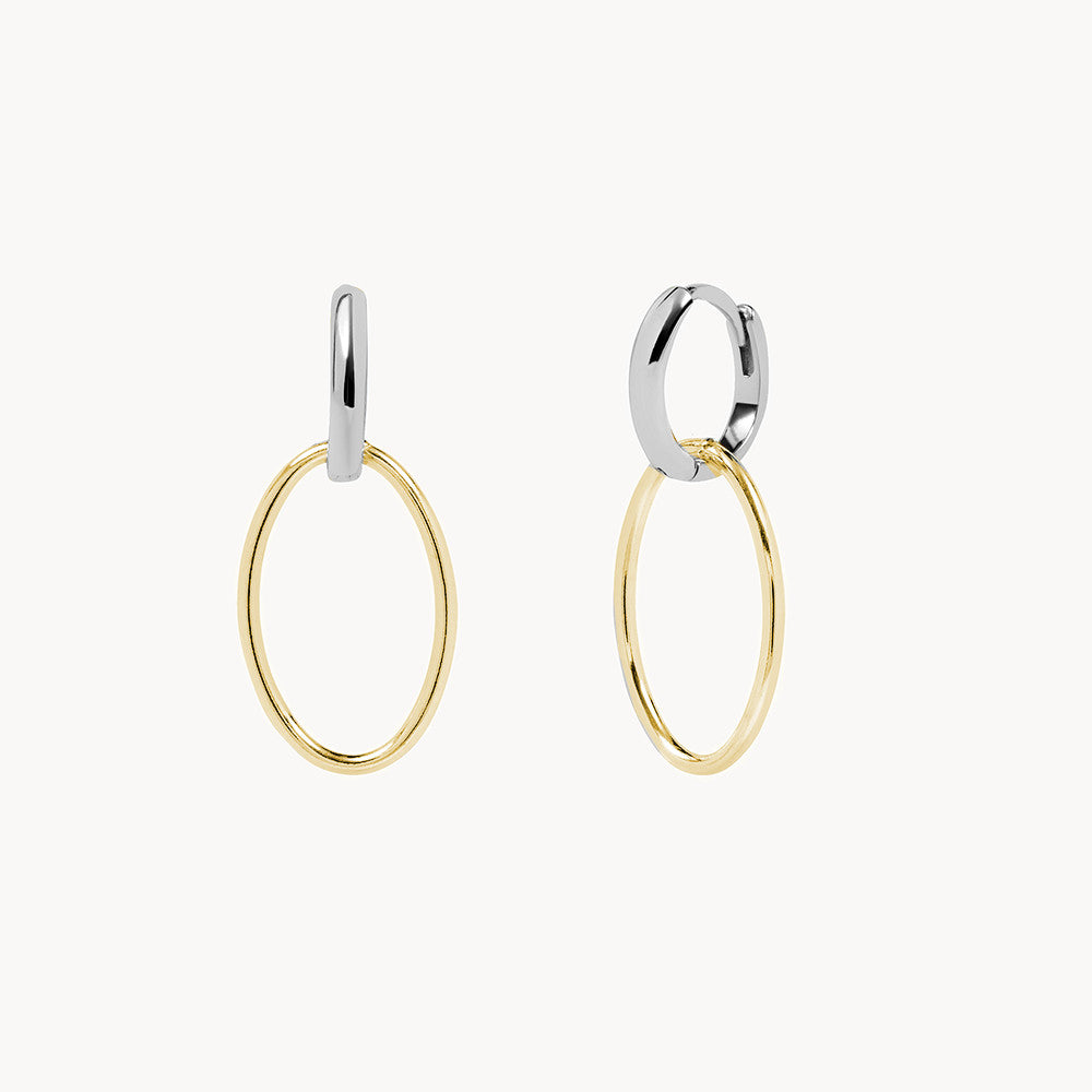 Los pendientes Mixi Gold están formados por dos aros ovalados entrelazados entre sí, combinando las combinaciones de l aro superior de plata 925 y el charm está bañado en oro de 18 qui Oro de 18 quilates y Plata de Ley 925.