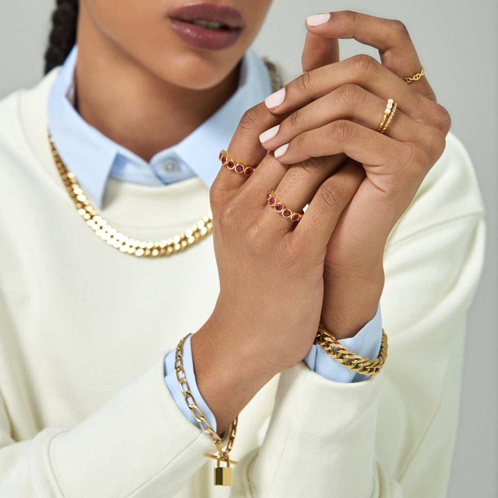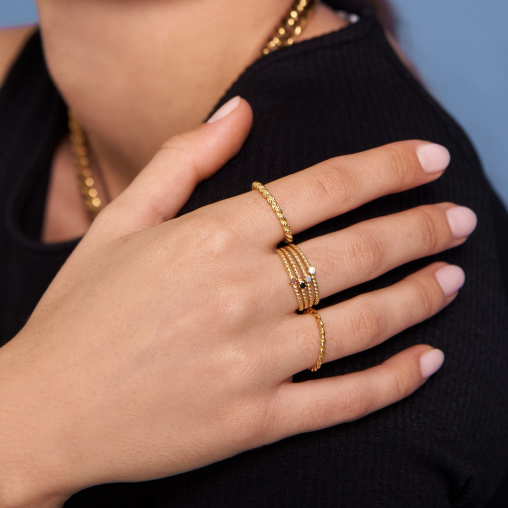 Un anillo básico que te permitirá hacer un sinfín de combinaciones, con anillos finos de circonitas, con anillos gruesos, con anillos de sello... ¡Inspírate en nuestras fotos para crear tu combinación más personal!