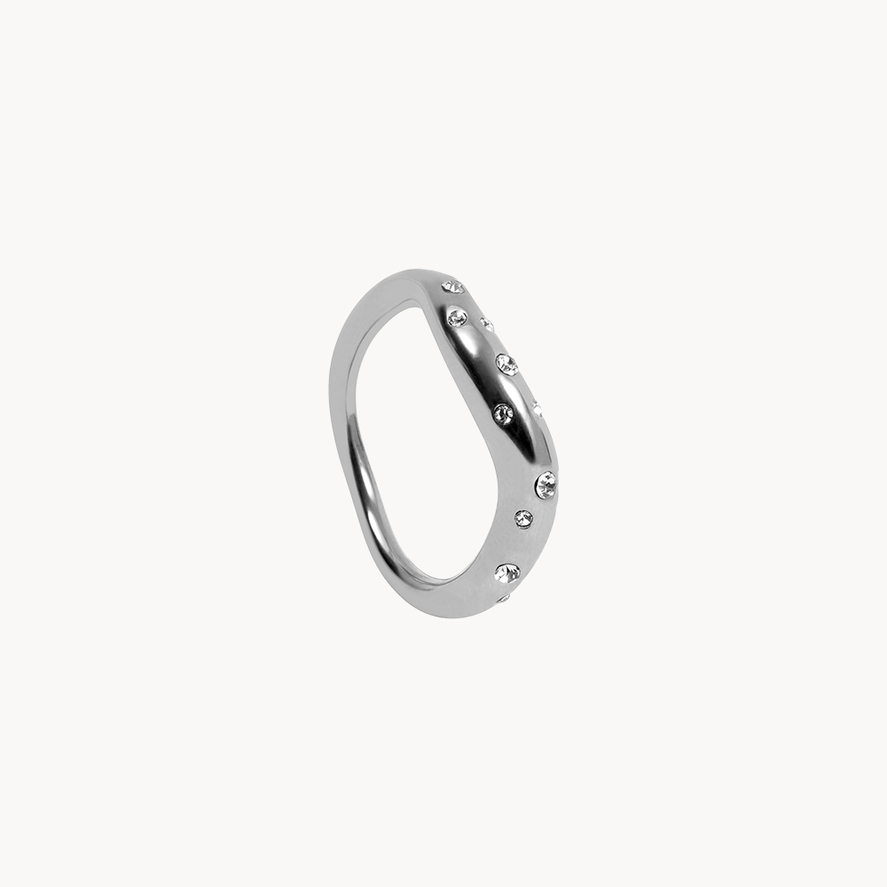 Fara es un anillo irregular de diseño orgánico, cubierto con sutiles circonitas blancas en la parte superior.