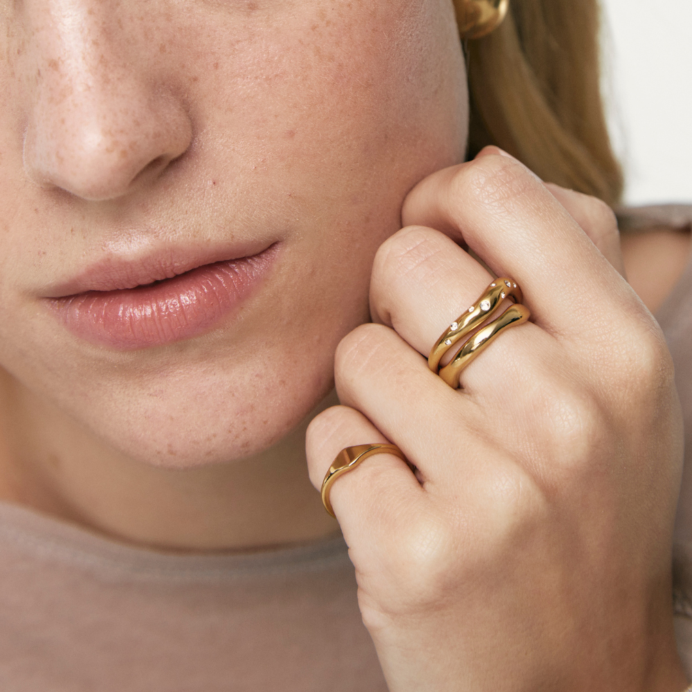 Un anillo fino en total tendencia por sus formas curvas que harán brillar tus manos de forma exponencial. Puedes elevar el look jugando con diversas unidades del mismo diseño.