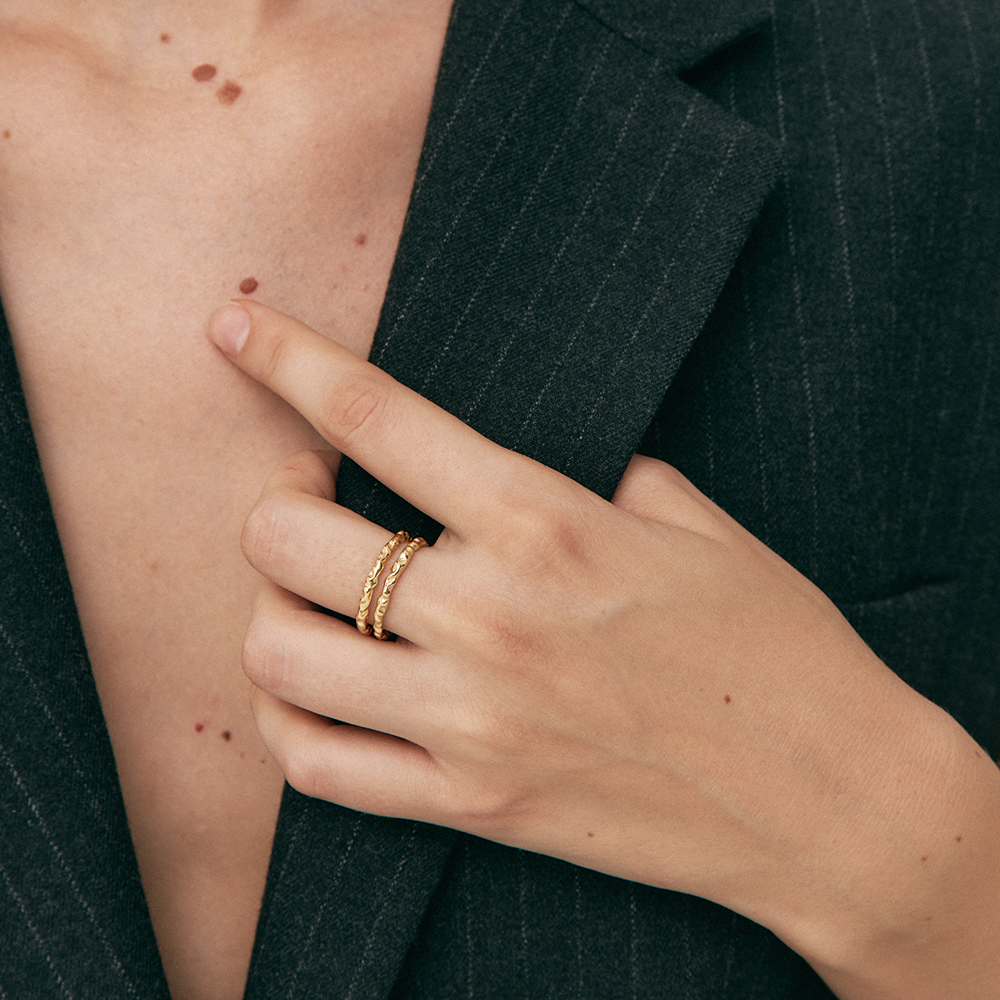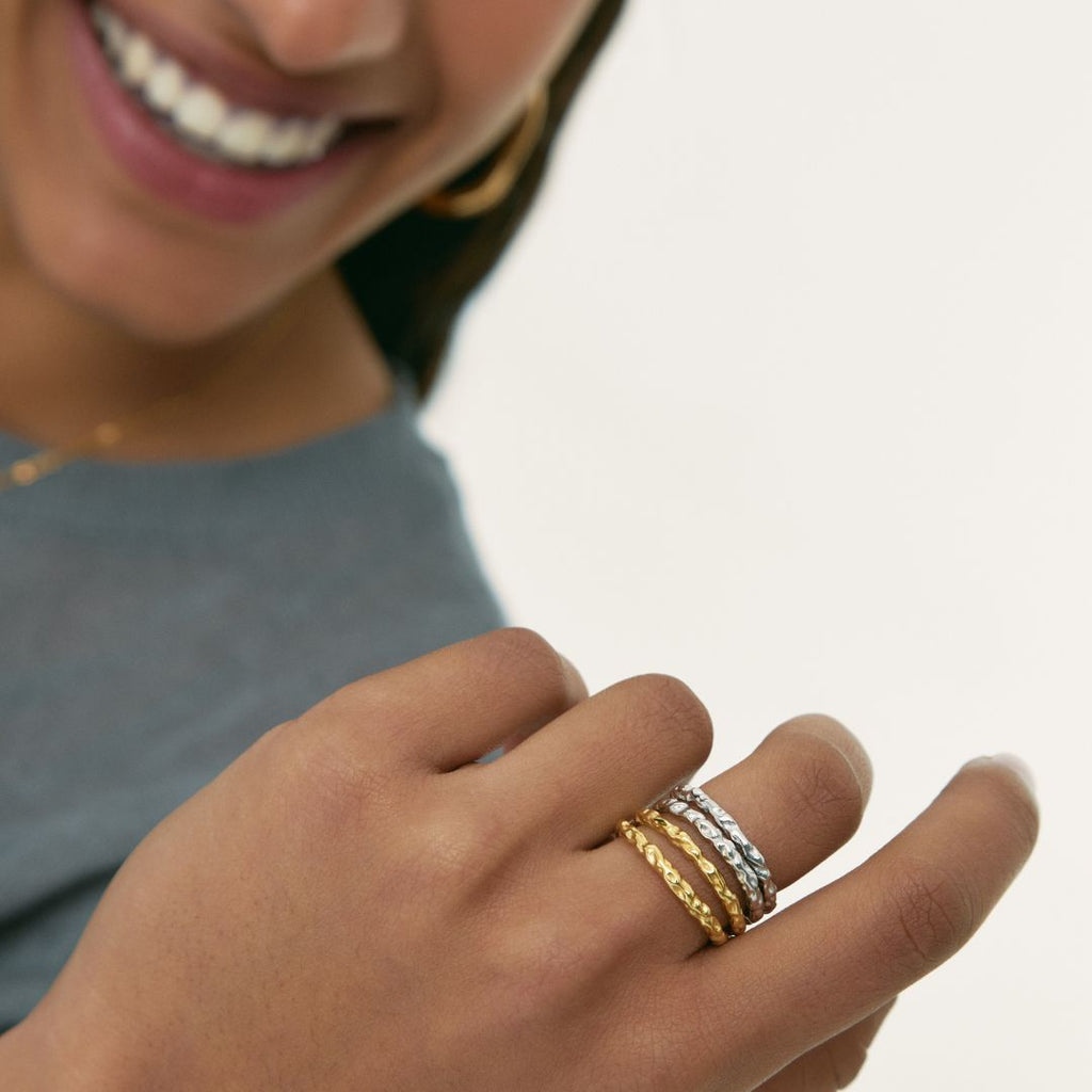 Nuestro nuevo anillo Raíz es un anillo fino y minimalista con un diseño texturizado que te dará un toque especial a tus combinaciones de anillos.