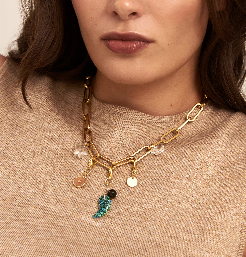 Podrás engancharlo en tus collares y pulseras de cadena con el cierre de mosquetón al eslabón de la cadena.