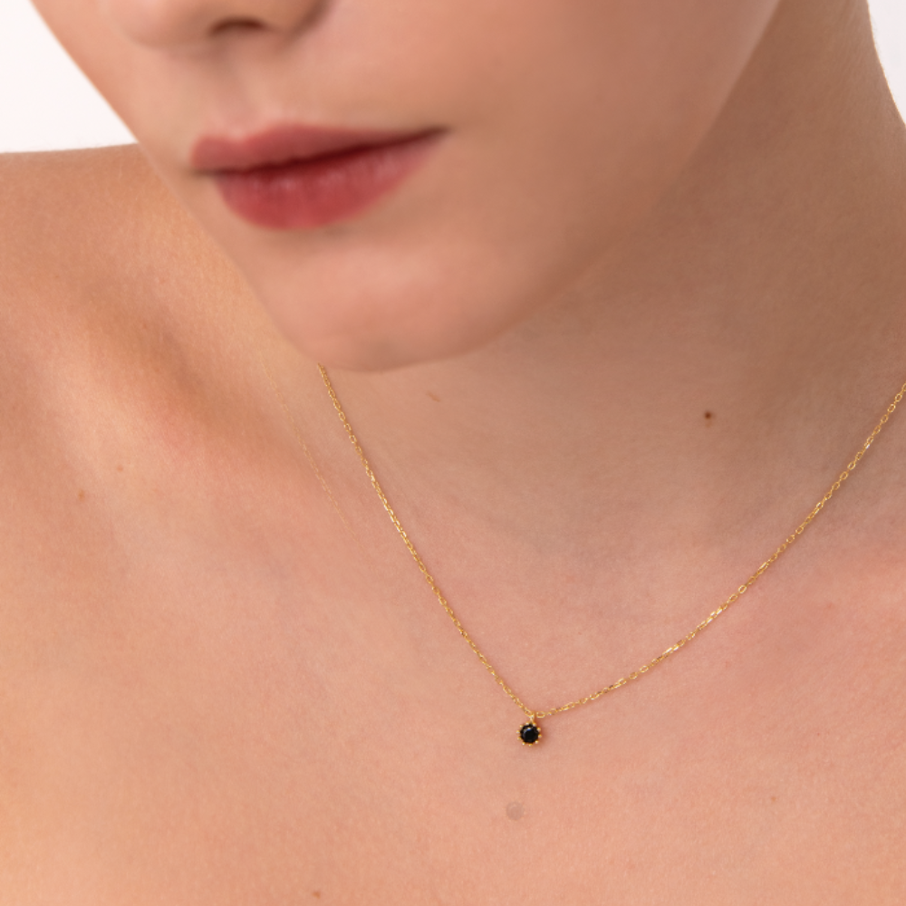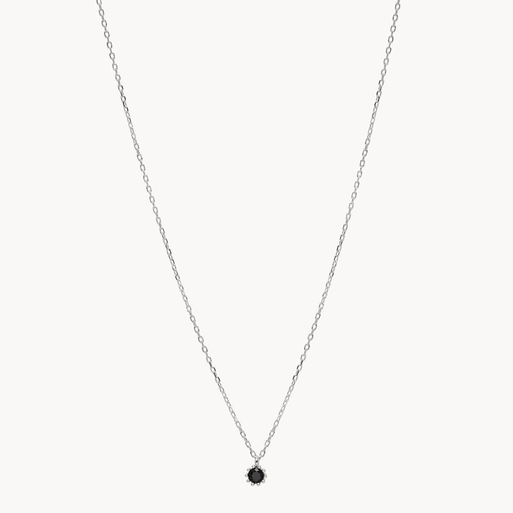 Mos Black es un collar clásico, tipo solitario formado por una cadena fina y una circonita redonda negra como charm central.
