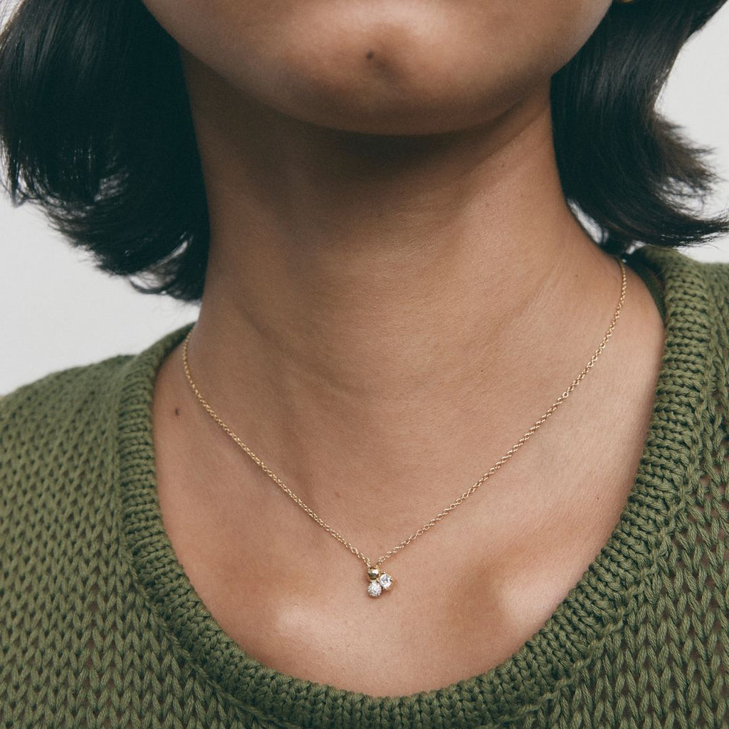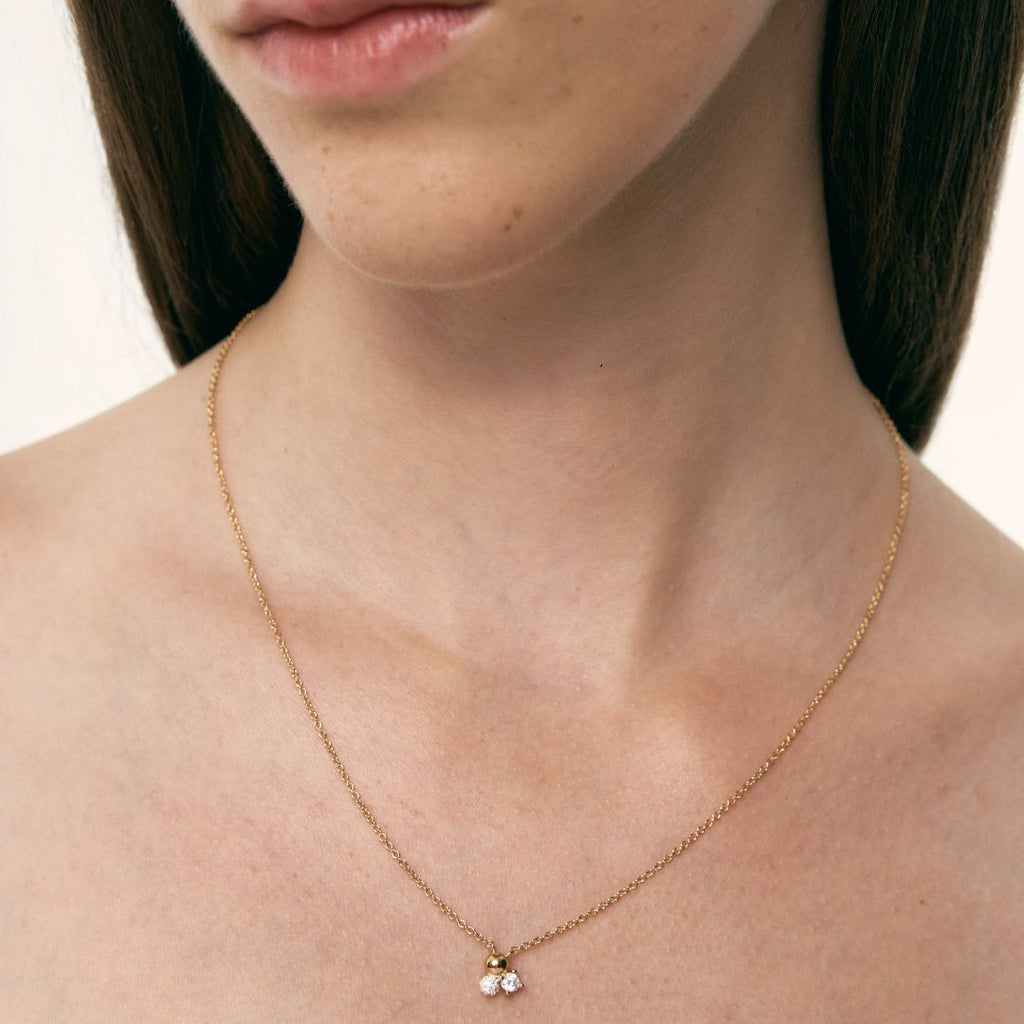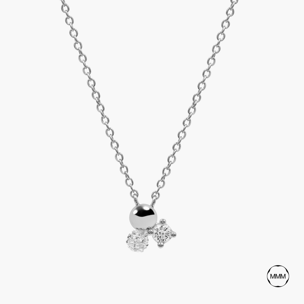 Faith es un elegante collar de cadena fina, que destaca por su diseño minimalista pero sofisticado. El centro de atención es un colgante compuesto por tres elementos: una esfera dorada, una circonita cúbica y una esfera con circonitas pavé.