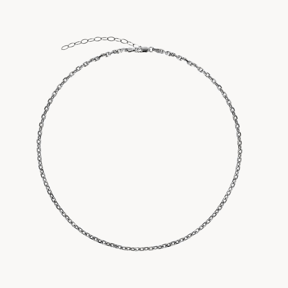 Lara es una cadena minimalista con un diseño de eslabones rectangulares entrelazados.