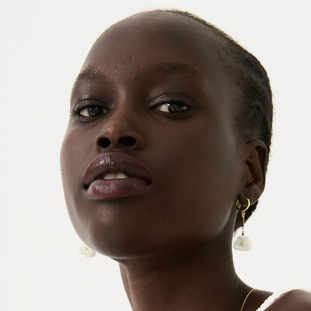 Azalea es un pendiente de aro creado con dos flores de nácar talladas a mano. Las flores de nácar consiguen darle un toque irisado a la pieza que rompe con el toque suave de la flor y el dorado de la cadena.