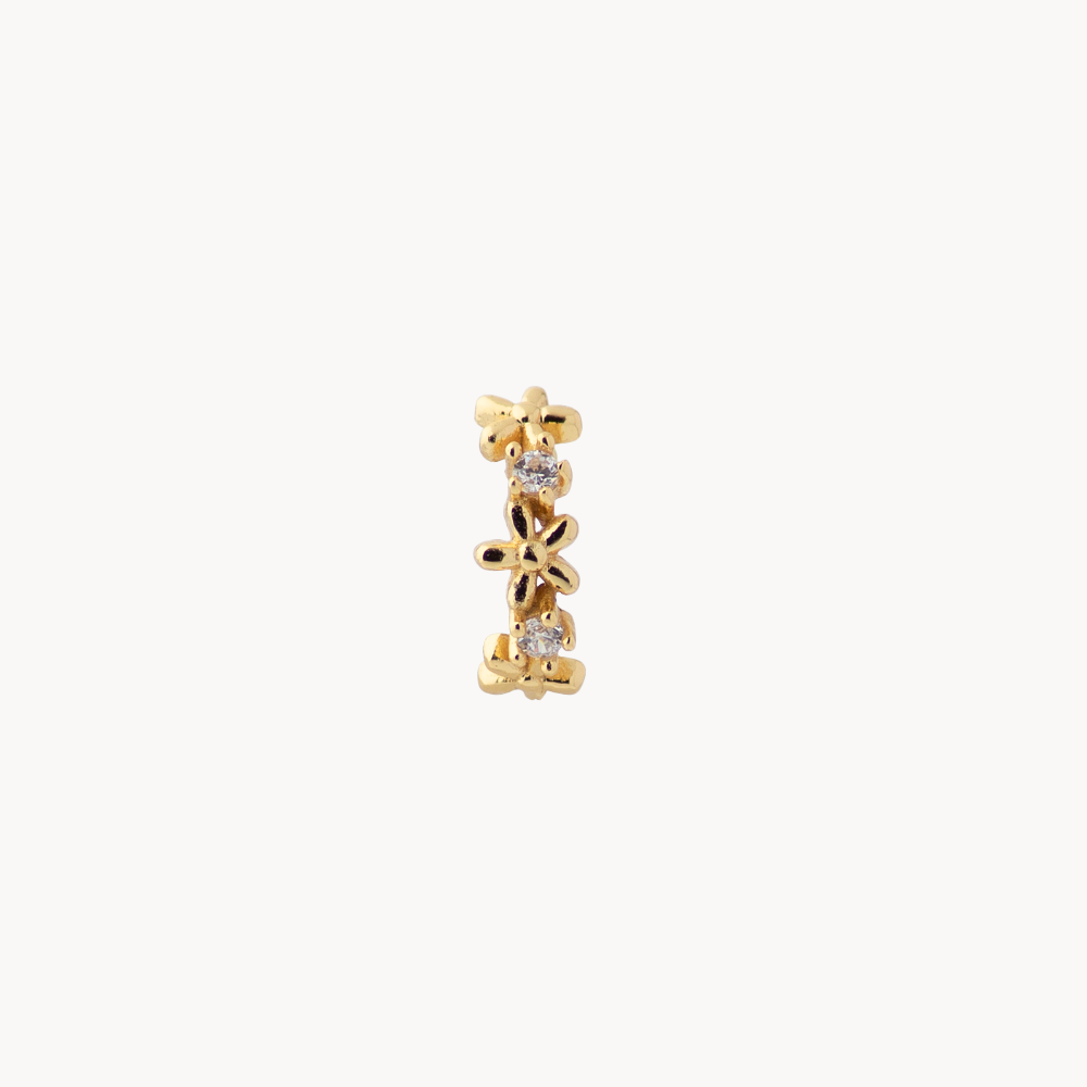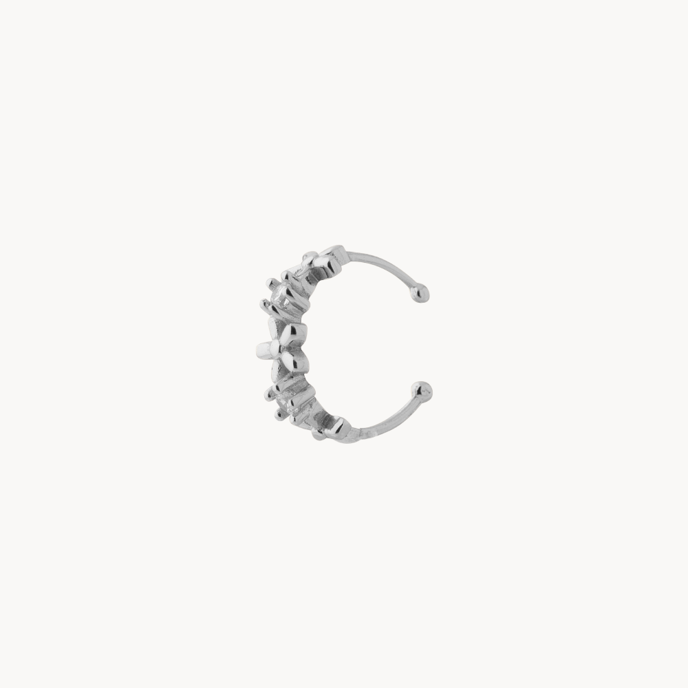 Este ear cuff moderno y elegante decorado con una fina cenefa de flores con circonitas blancas cúbicas.