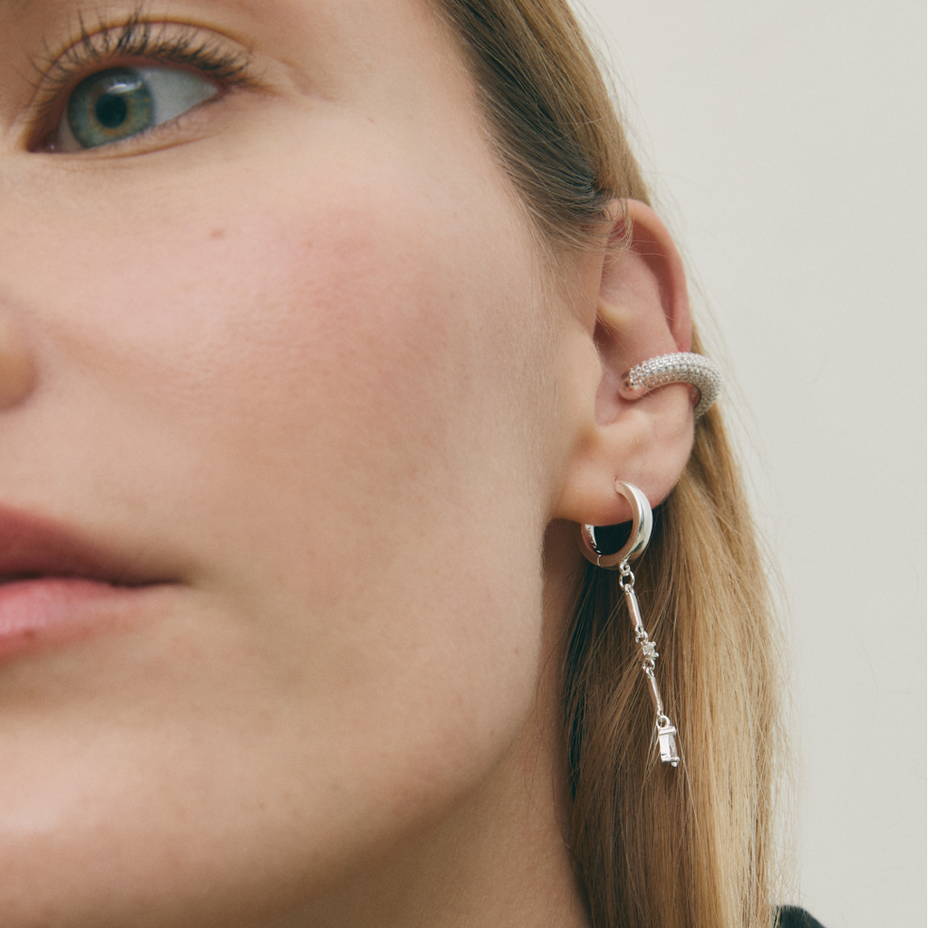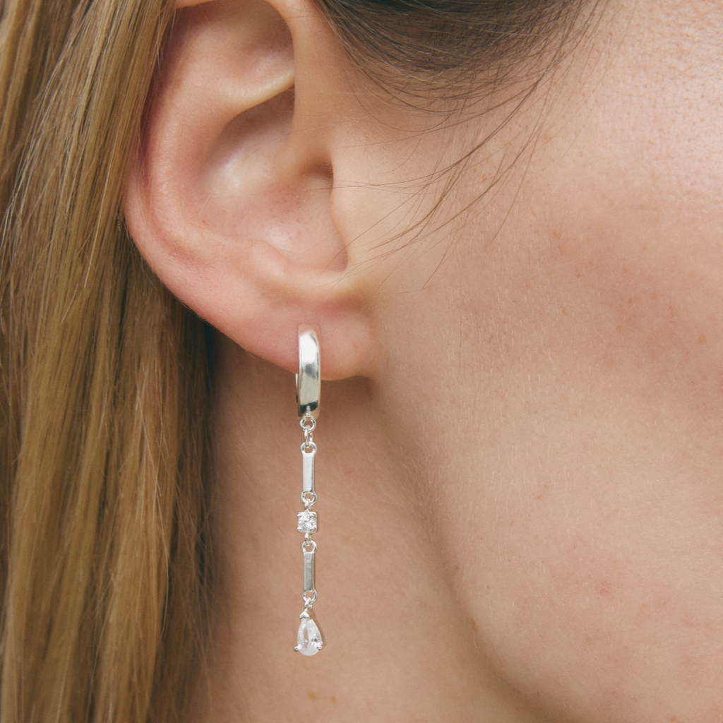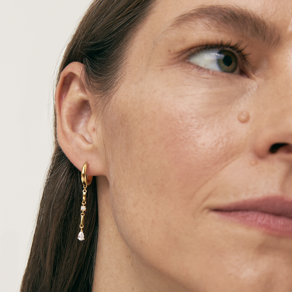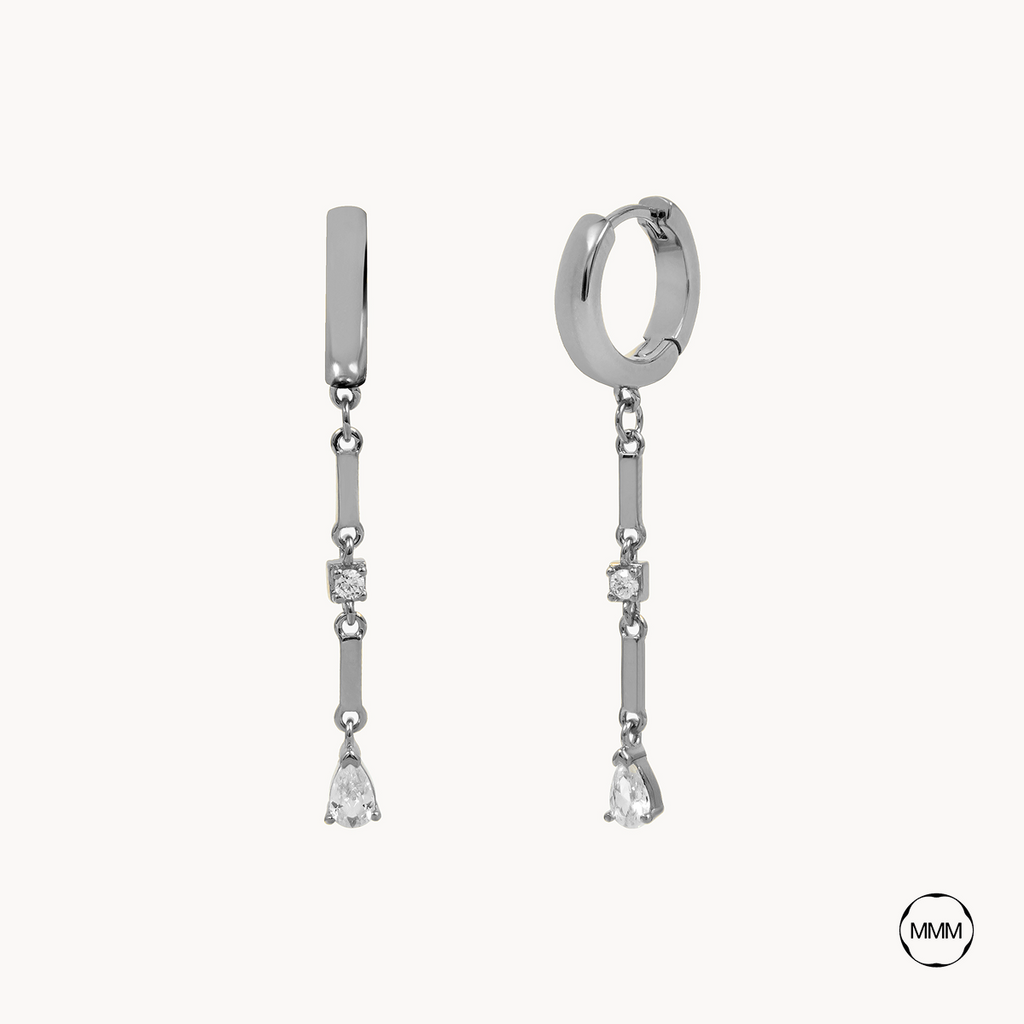 Lluvia son unos pendientes largos de aro liso con un charm de cadena de dos eslabones y dos circonitas intercaladas.