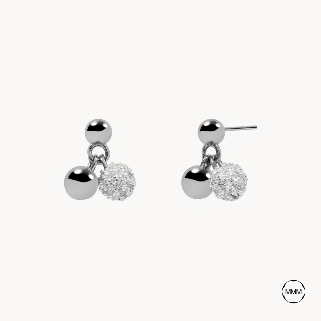 Cada pendiente presenta una combinación de una esfera dorada y circonitas pavé, colgando de manera elegante que aporta movimiento y destellos luminosos.