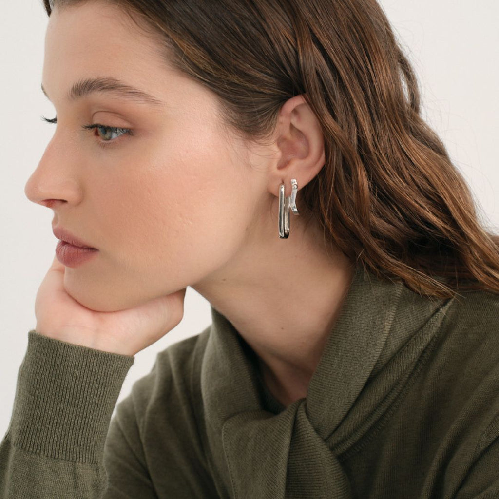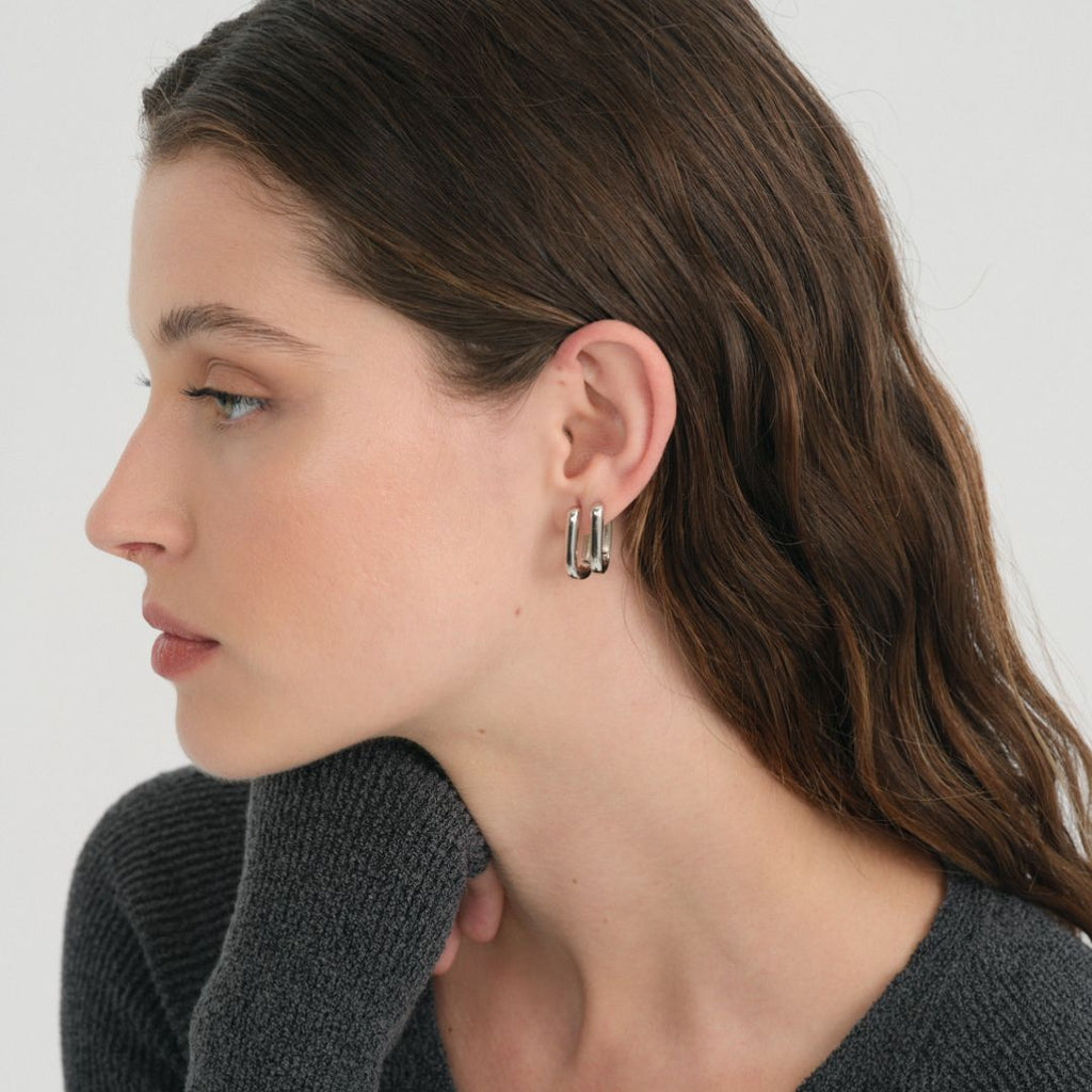 Este pendiente con diseño geométrico se destaca por su forma ovalada y su estilo moderno. Su estructura minimalista ofrece un toque de sofisticación que complementa cualquier conjunto.