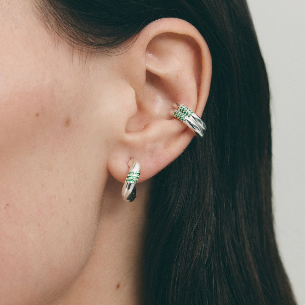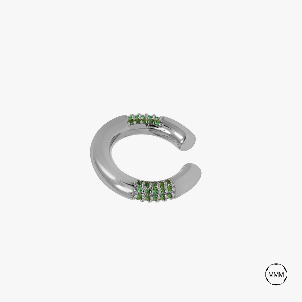Nuestro Ear cuff Green Deva está cubierto de circonitas pavé verdes a cada lado de su diametro para aportar un toque de brillo y color a tus combos .