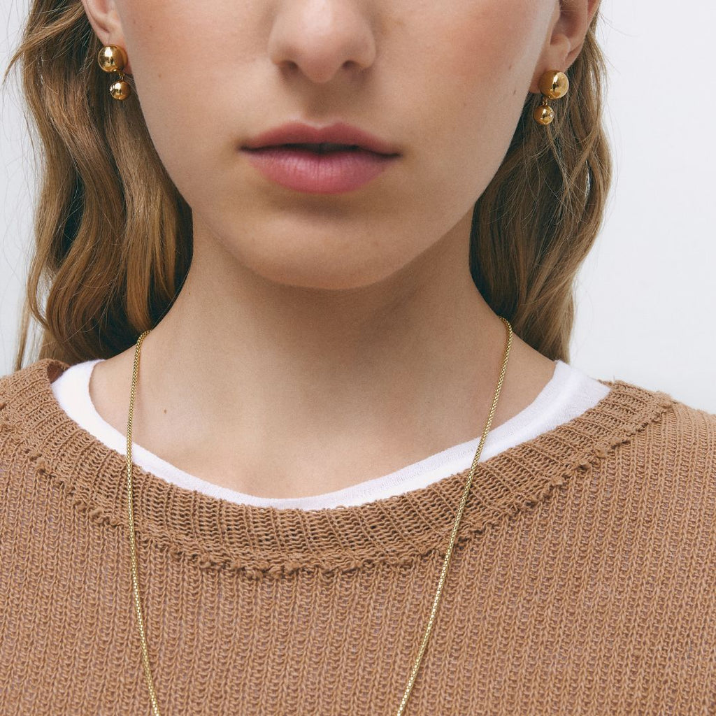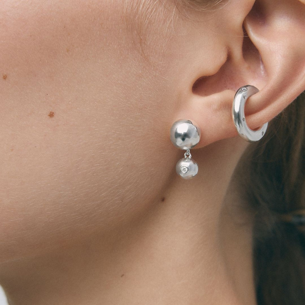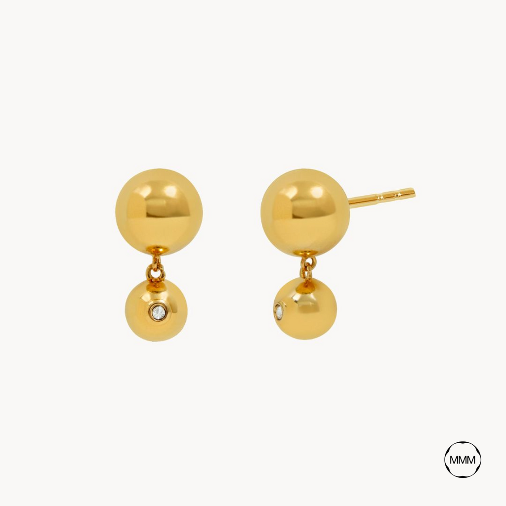 Estos pendientes de estilo vintage combinan elegancia y movimiento con dos bolas de tamaños distintos, una de ellas adornada con una circonita central de 2 mm.