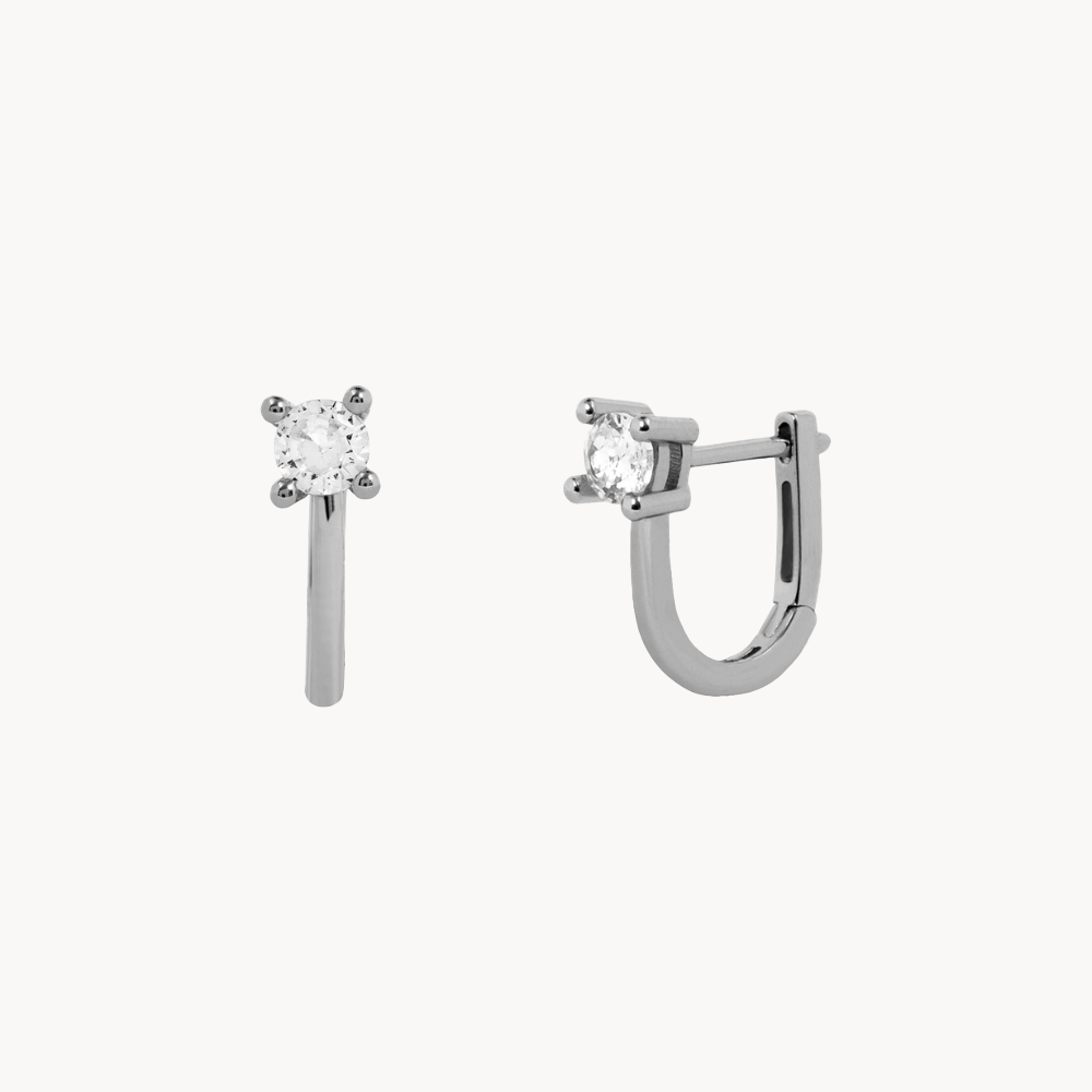 Gracias a sus cuatro grapas en cada esquina y la forma circular de la circonita, el diseño de los pendientes Main presentan un juego de formas geométricas que le aporta un toque original a la joya.
