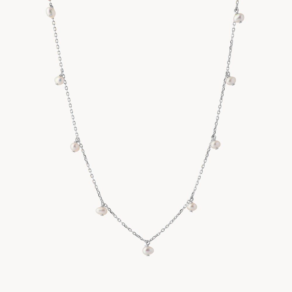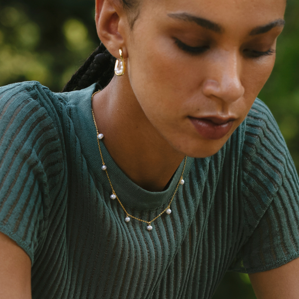 El collar Eternity constan de una fina cadena y varios charms de auténticas Perlas naturales de río que te darán movimiento y luz a todos tus looks.