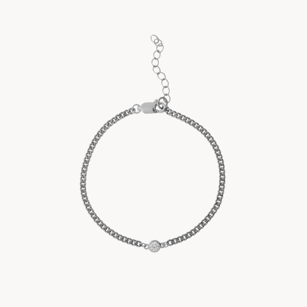 Poise es una pulsera de cadena barbada con una circonita solitary blanca en el centro. Pulsera minimal y elegante para llevar ocasiones especiales o para tu día a día combinado con otros modelos.