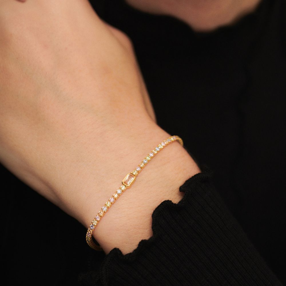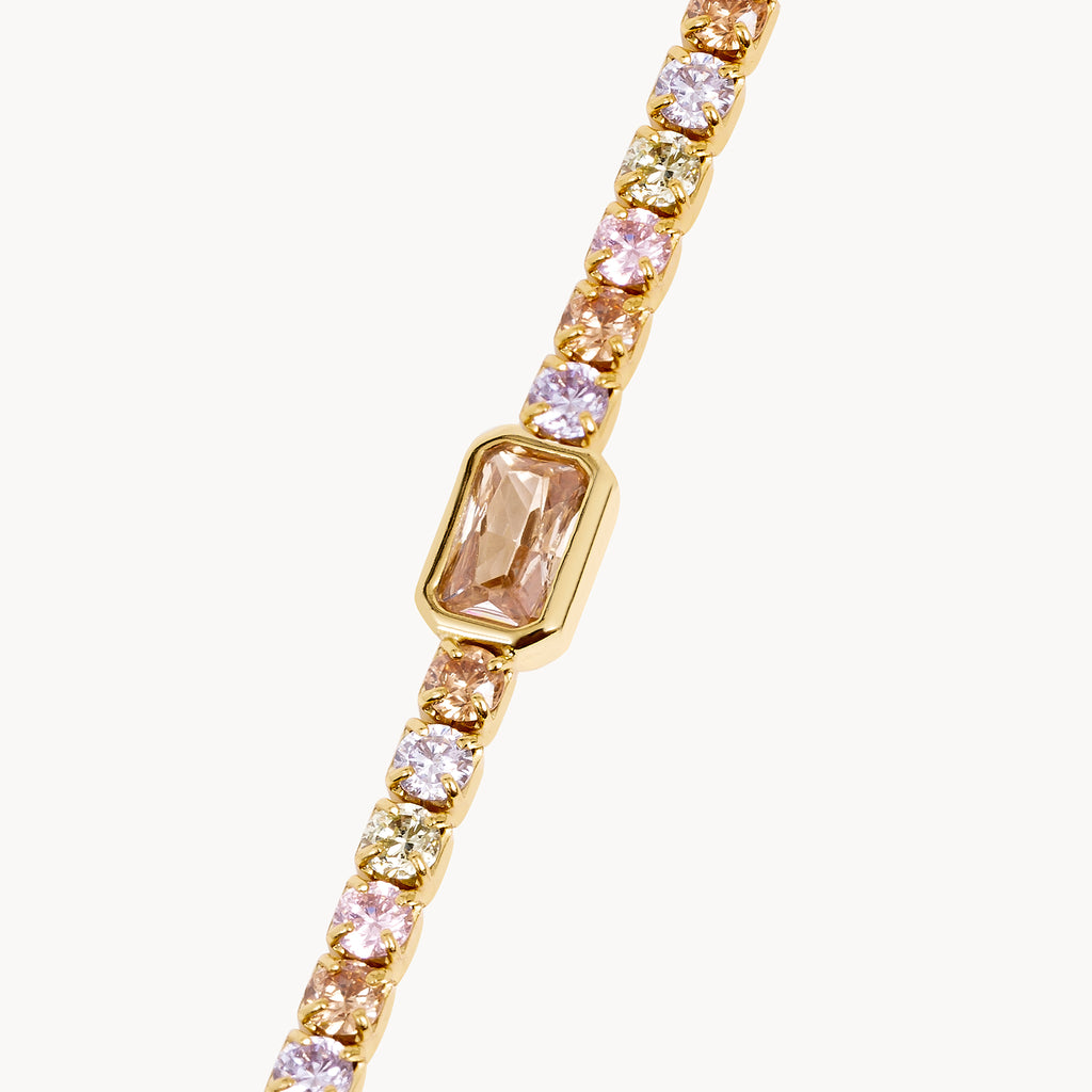 La Pulsera Tennis Honey está creada para dar luz y color a tus outfits. Con un seguido de circonitas cúbicas en tonos pastel y una circonita rectangular central, eleva tus looks dando color y elegancia.