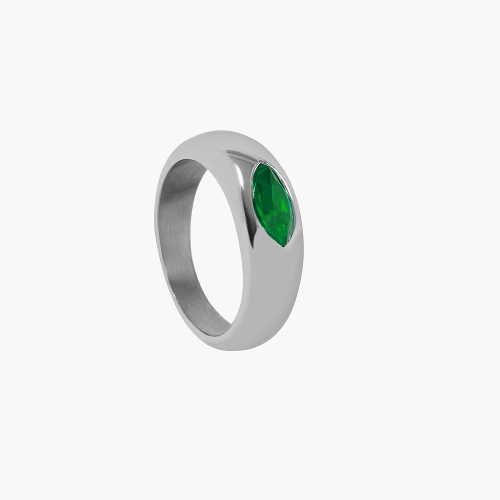 Our Green Blondie ring is a thick, signet-type ring with an oval green zirconia in the center of the jewel.