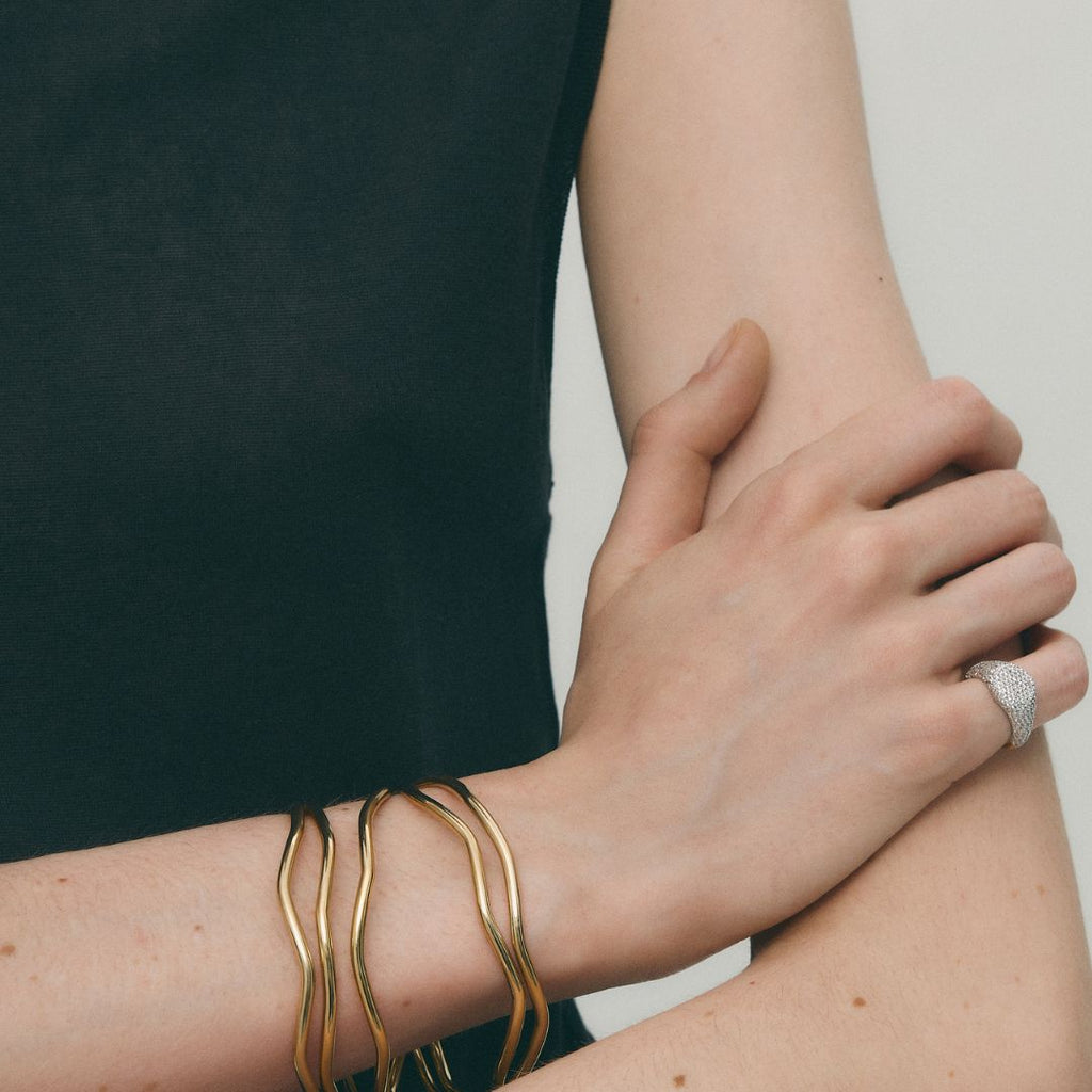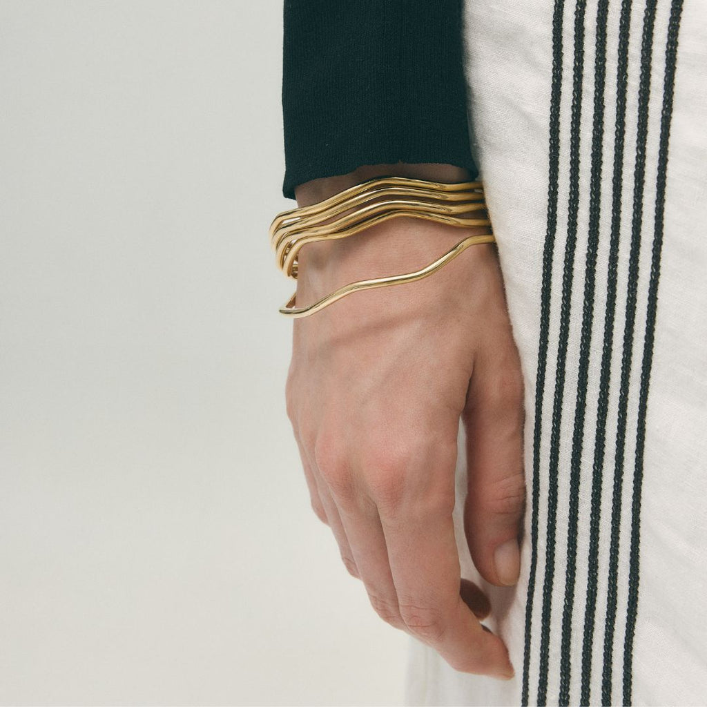 Trio Organic Bangle consists of 3 bracelets to add a fashionable touch to your look with its organic, wavy shapes made of water-resistant steel.