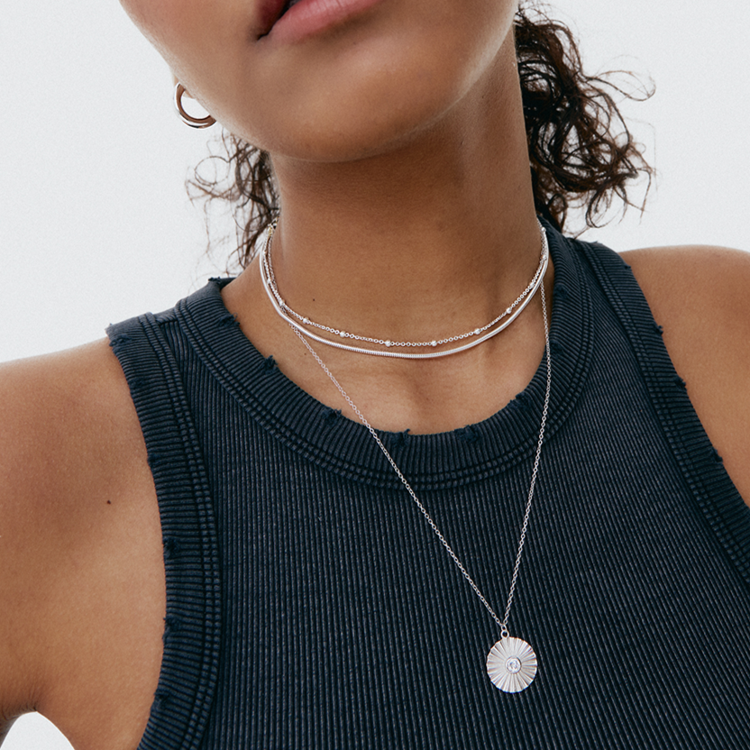 Le Soleil is a fine chain necklace with an engraved medallion and a central zirconia that will add a lot of light to all your necklace and chain combinations.