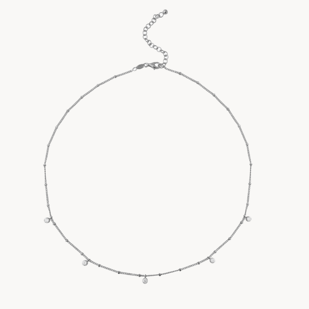 Lyra is a chain choker with links and beads and five bright white zirconia charms that will add light and movement to your necklace combinations.