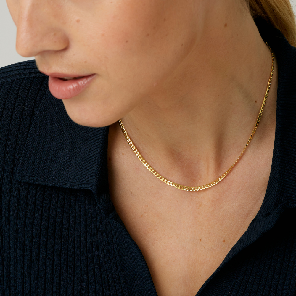 Mirtle is a vintage style flat link chain choker made of 925 sterling silver plated with 18k gold.