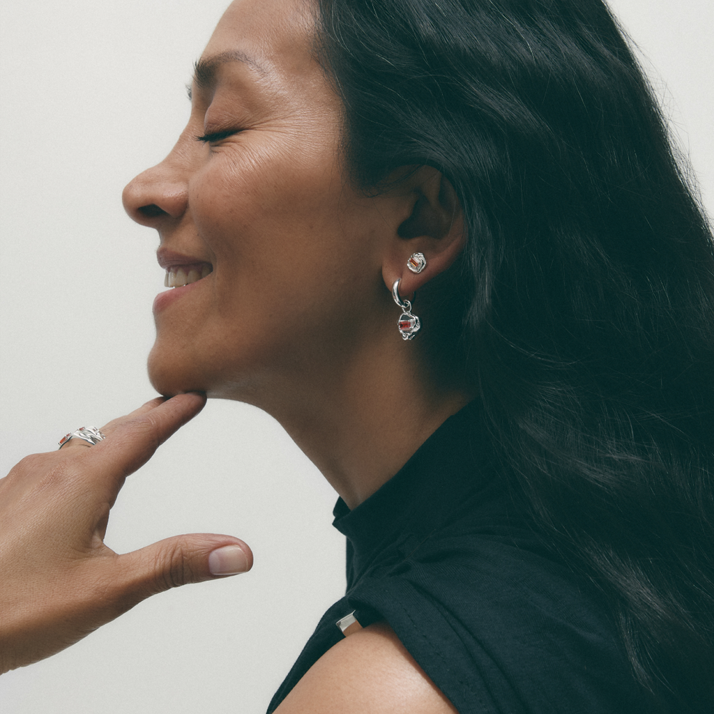 Sakana are hoop earrings with a dangling charm of organic design and an intriguing relief effect , evoking the essence of natural transformation. These earrings encapsulate the spirit of Kaizen, the Japanese philosophy.