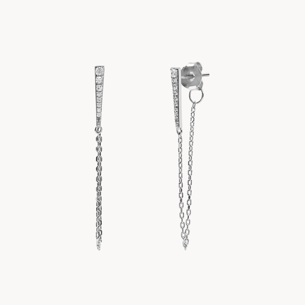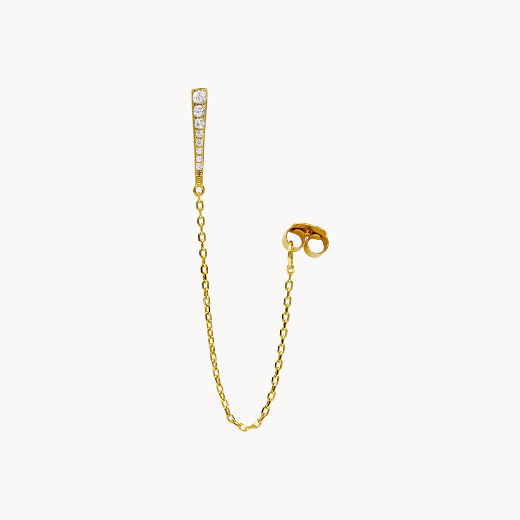Sword Chain is an earring with a triangle covered with white zircons on the front along with a thin and elegant chain that will wrap around your ear to the back.