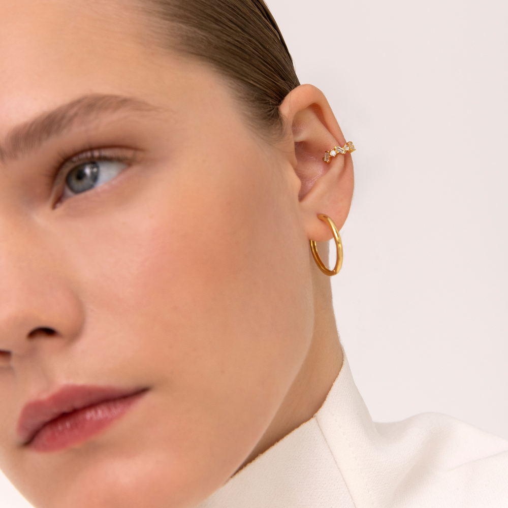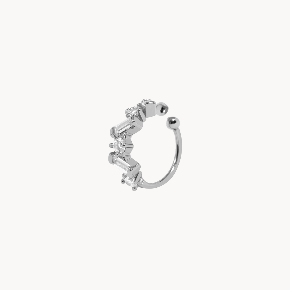 Lua is a minimalist ear cuff that alternates white baguette-shaped zirconia and round cubic zirconia.