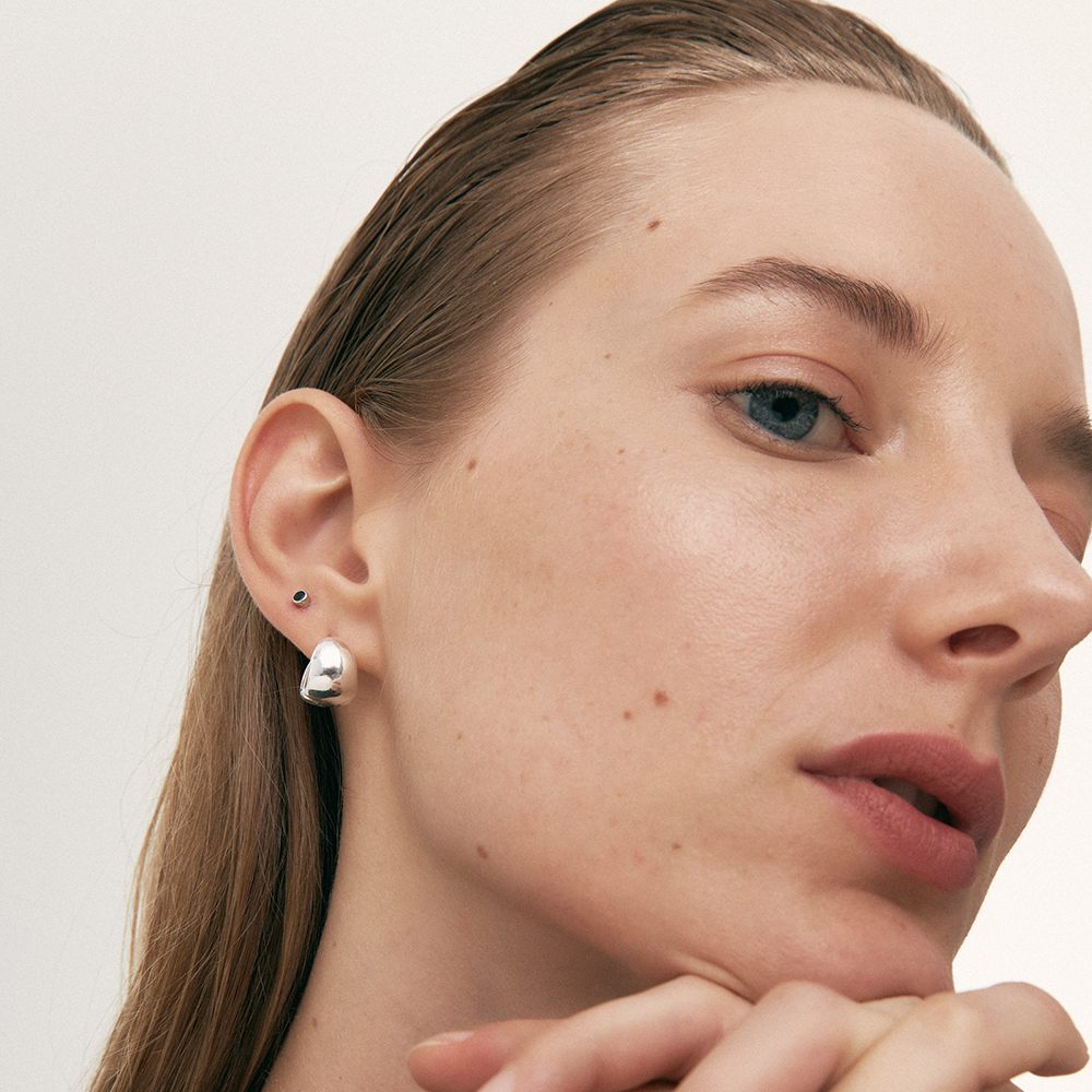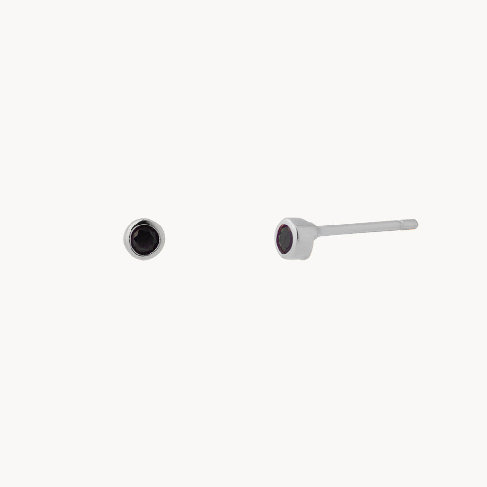 Lui are round butterfly-clasp earrings with a black zirconia in the center of the circle.