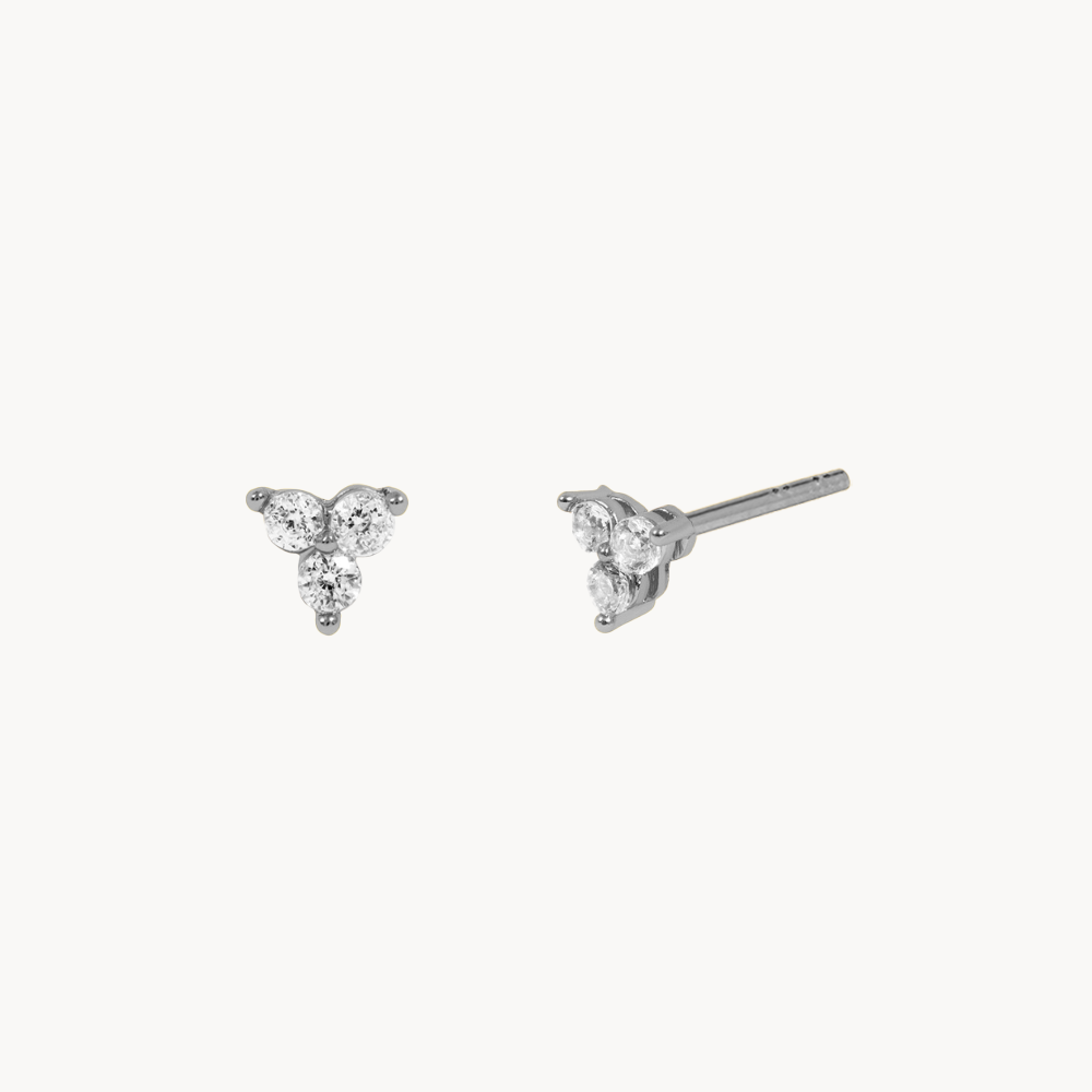 Riom are mini triangular flower-shaped earrings with three white cubic zirconia stones.