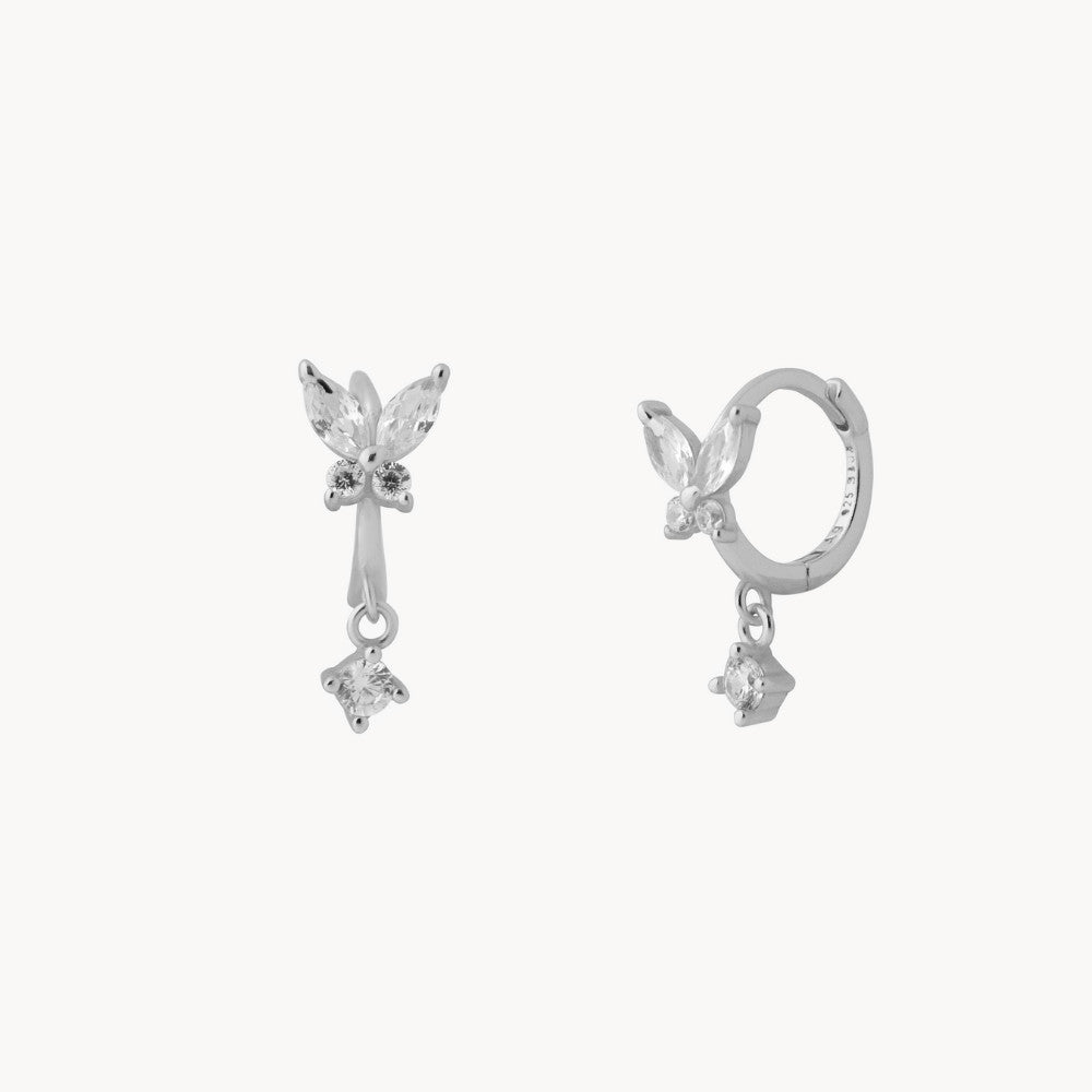 The Dena earrings are hoops with a butterfly on the front made of zircons and a matching pendant charm.