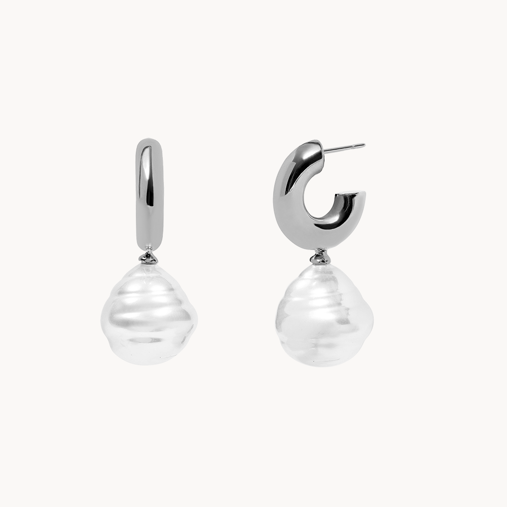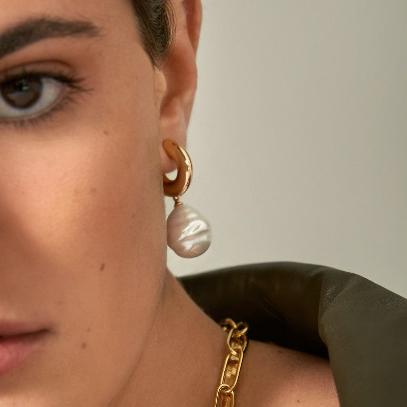 The Tana earrings are hoops with a butterfly clasp, with a striking baroque pearl at the bottom of the jewel.
