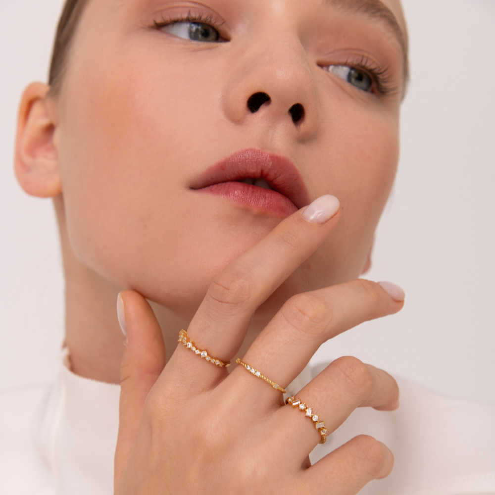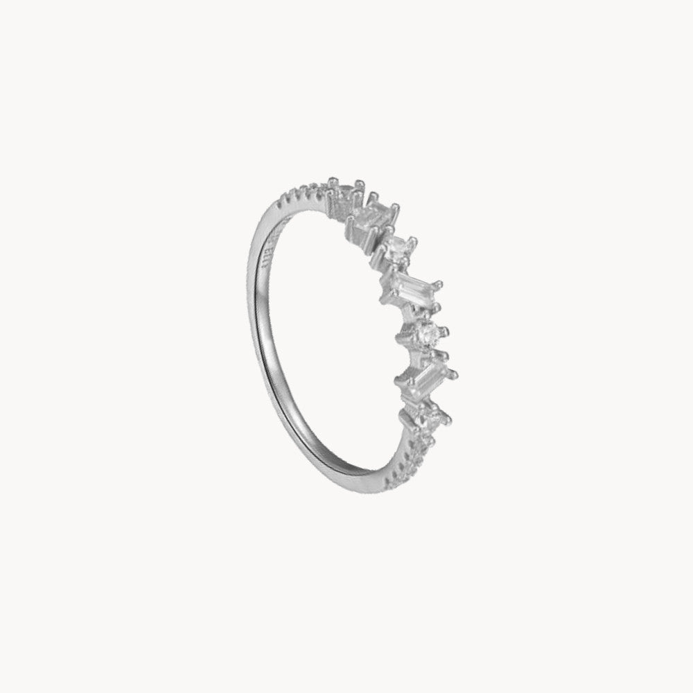 Brisa es un anillo fino adornado con pequeñas circonitas blancas de diferentes formas y tamaños.