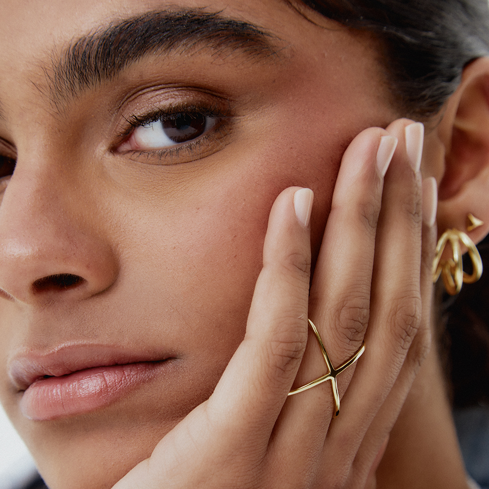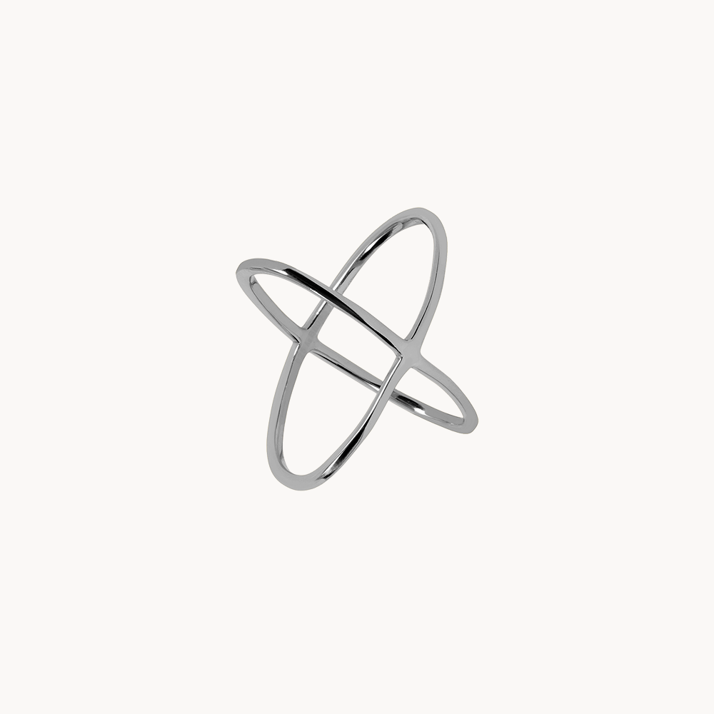Cross es un anillo de estilo criss cross con dos aros perpendiculares que se unen entre sí formando una aspa o cruz.