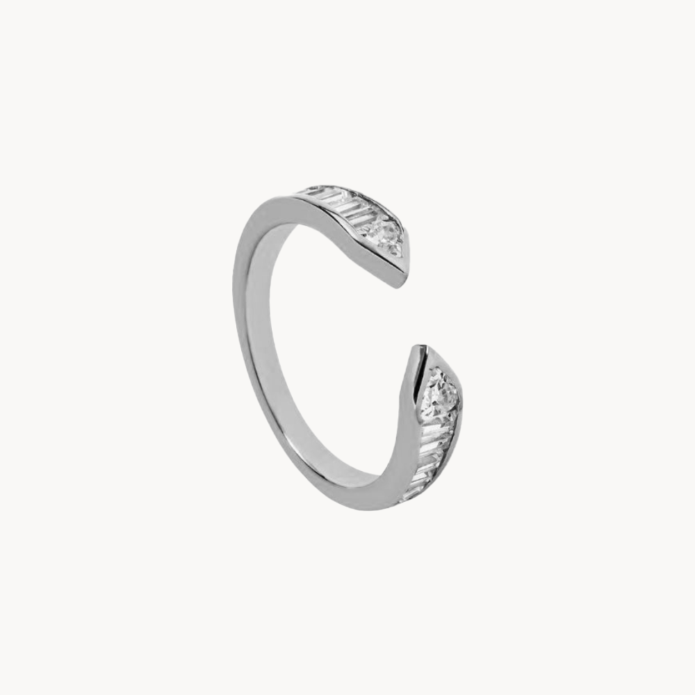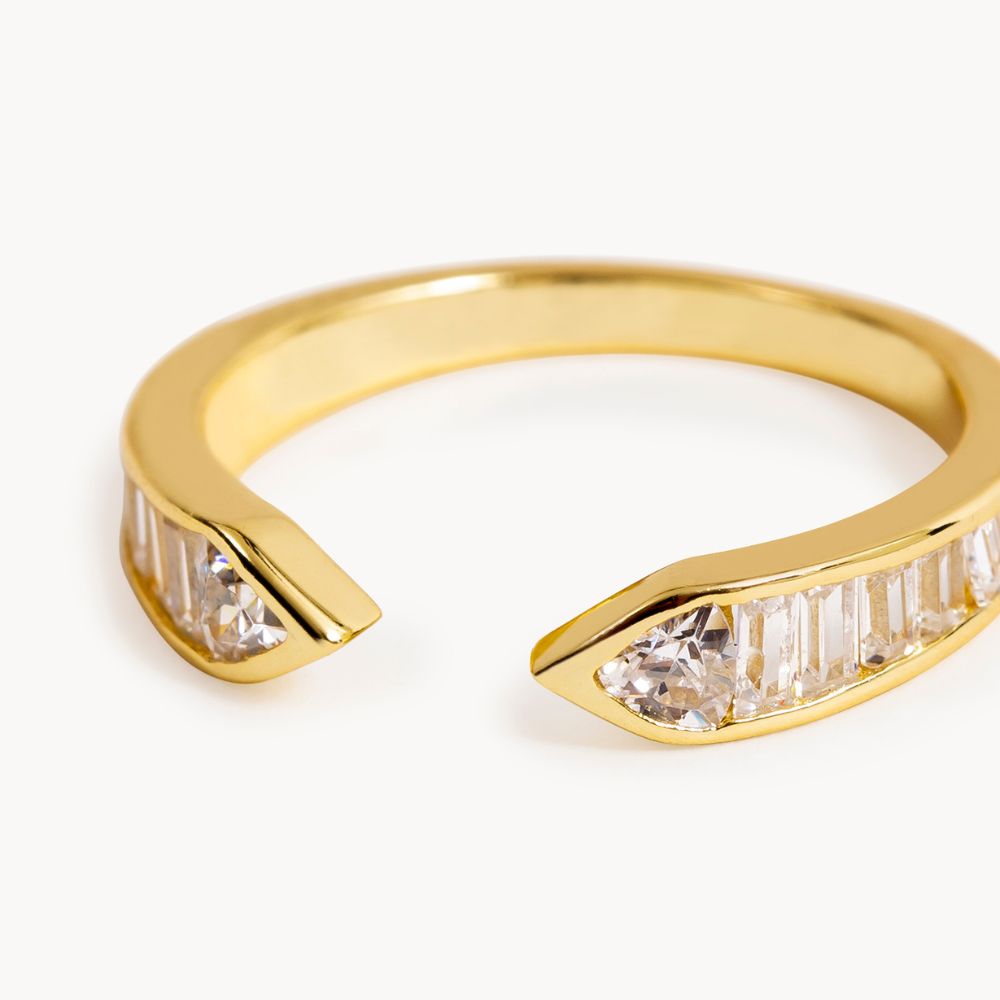 Lucente es un anillo abierto con circonitas baguette de diferentes medidas en la parte frontal de la joya.