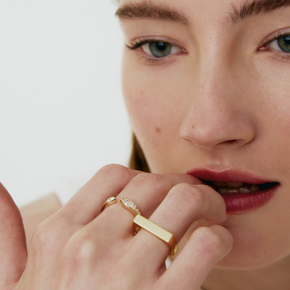 Nuestra modelo lleva el anillo Lucente junta a la pulsera Tennis Link y el anillo Celeste.