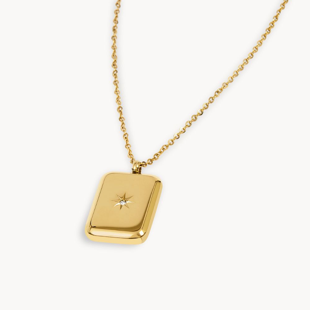 Square Stardust Steel es un collar tipo sello con una estrella grabada y una pequeña circonita brillante en el centro.