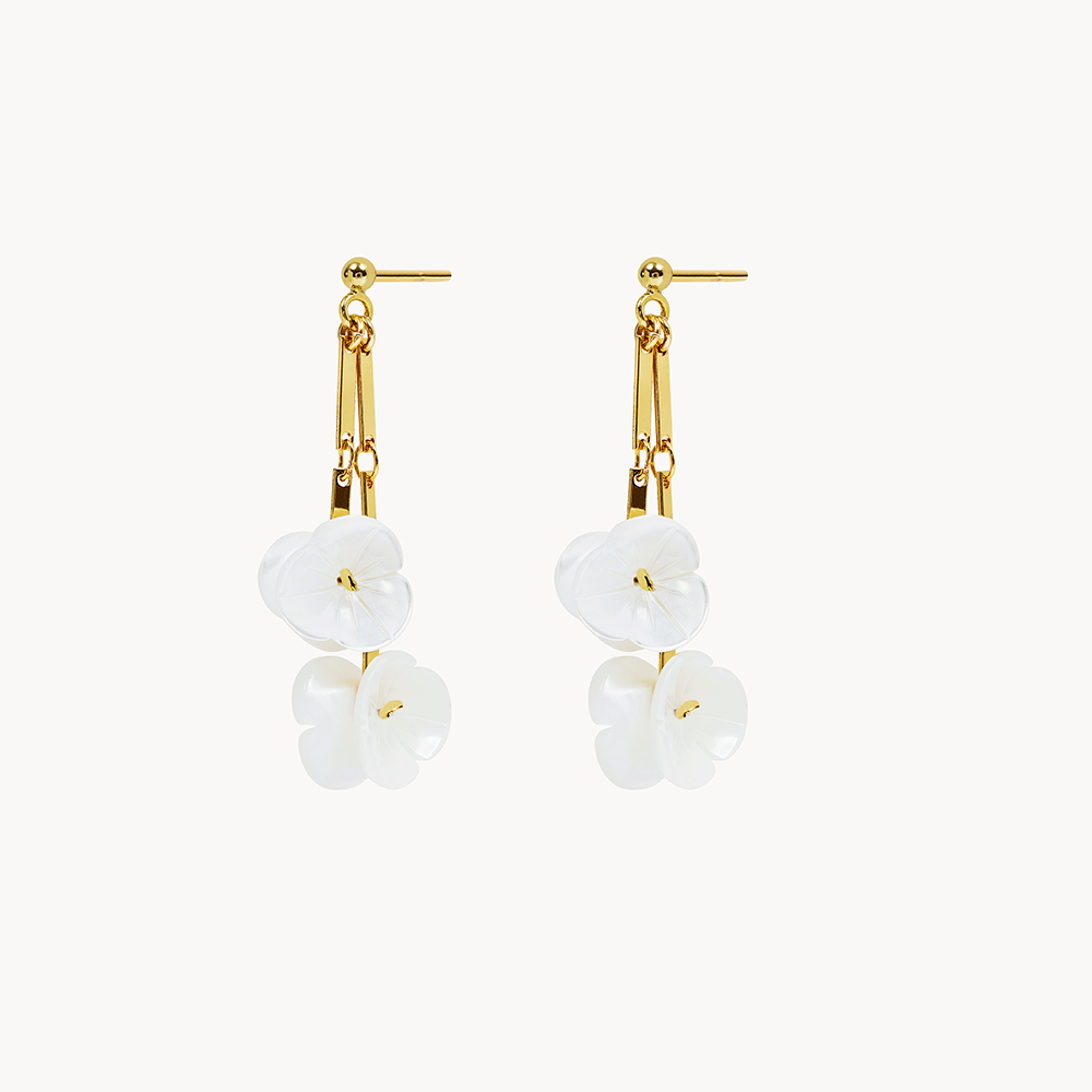 Petunia es un pendiente moderno y asimétrico de cadena con 2 flores de nácar talladas a mano a cada lado.