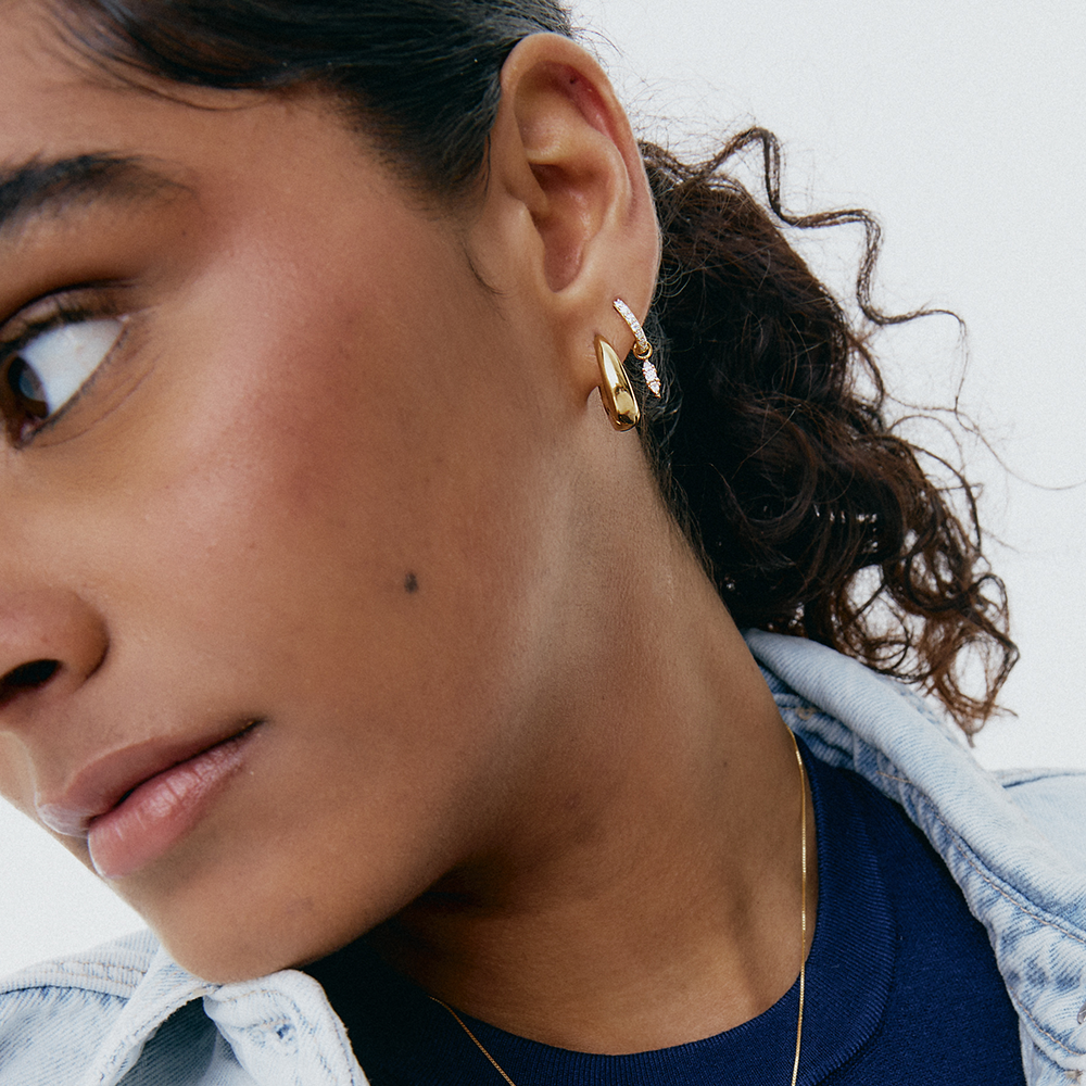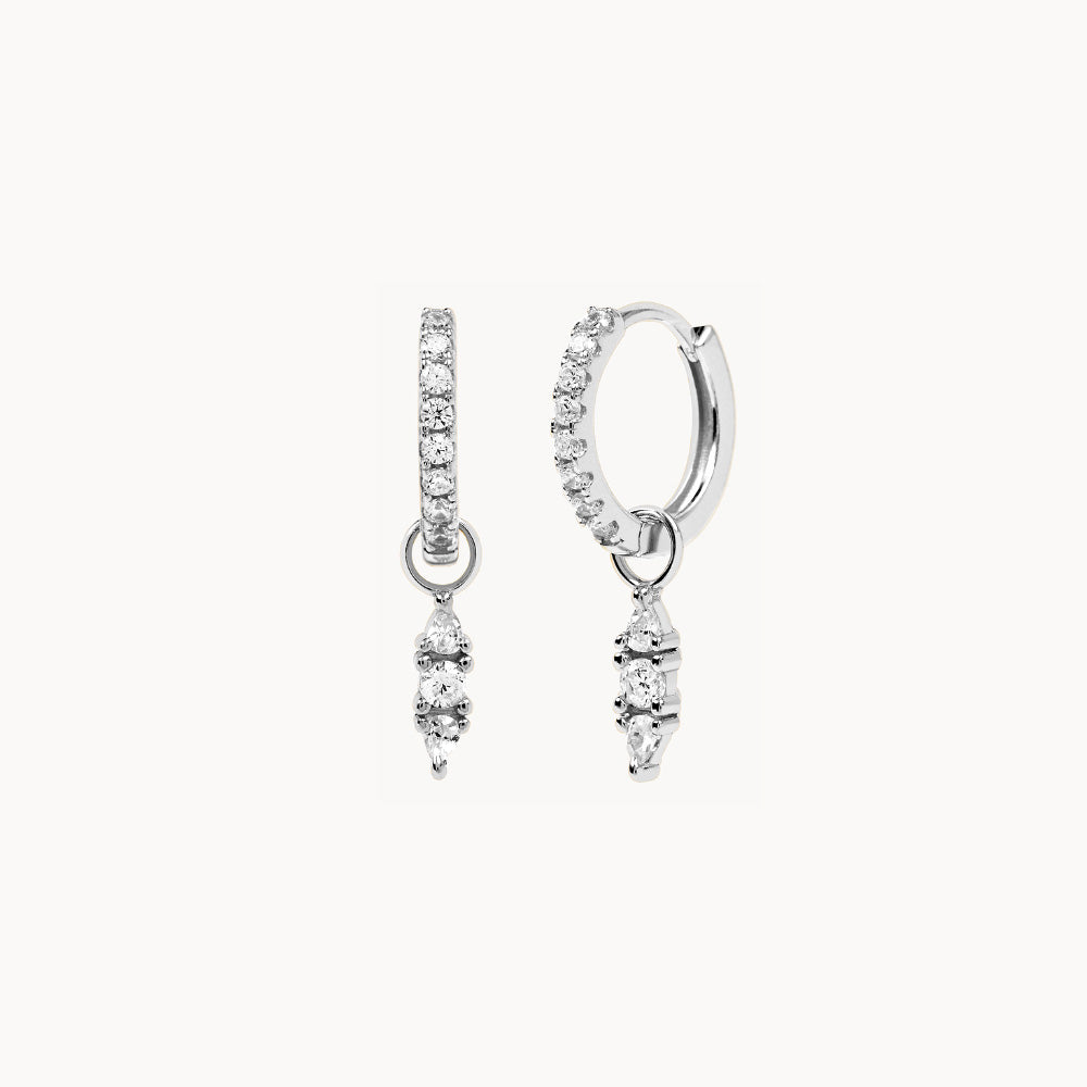 Los Pendientes Drop son unos aros pequeños de inspiración minimalista recubiertos de circonitas. Con detalle de lágrima colgante de 3 circonitas. Discreto, elegante y casual.