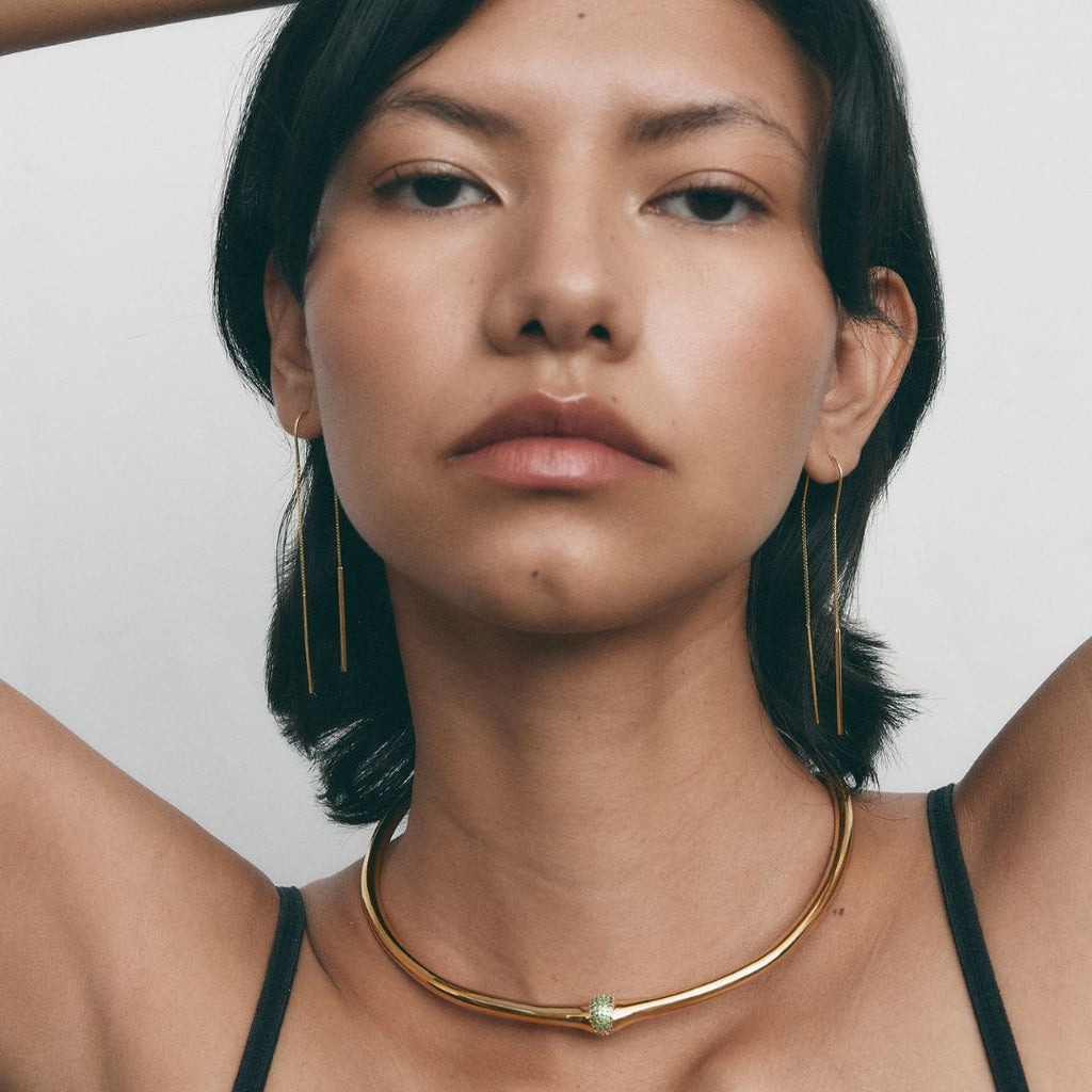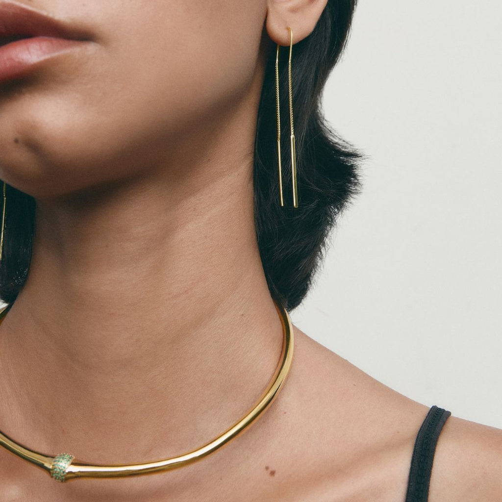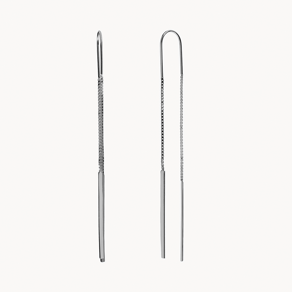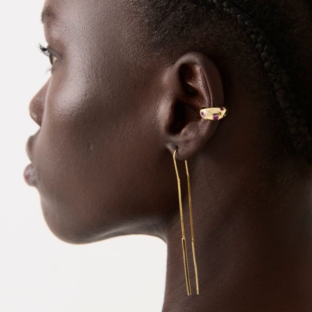 Diseñados para introducirse a través del agujero del lóbulo, la cadena cuelga delicadamente tanto por delante como por detrás de la oreja, creando un efecto visual llamativo y dinámico.